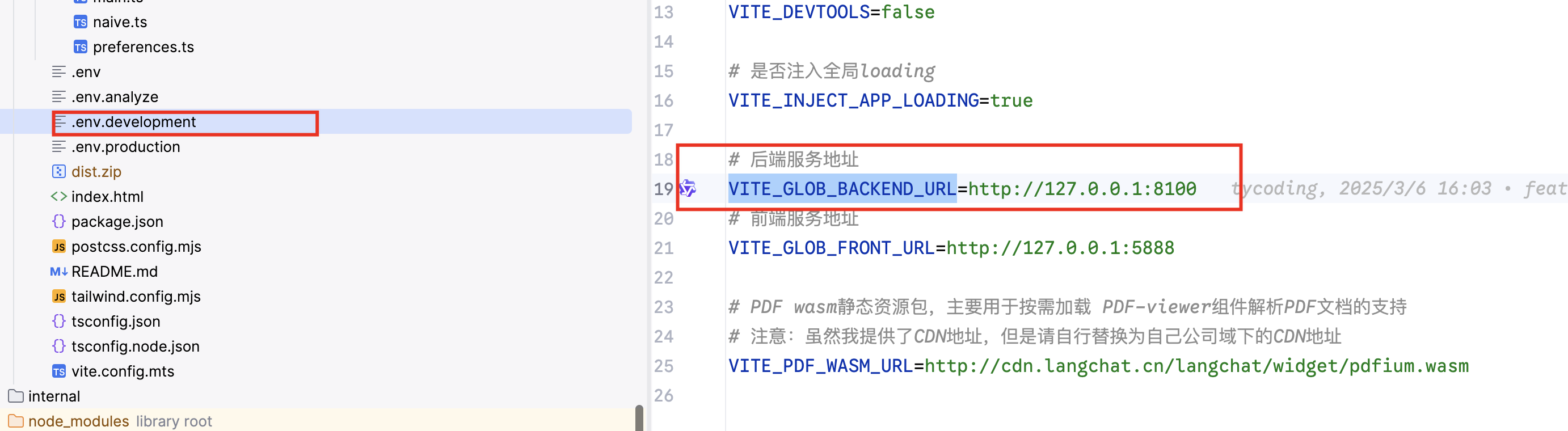 注意:网页上看到的 http://127.0.0.1 这个配置来自于前端的 .env 文件,实际上你应该配置真实项目后端部署的域名