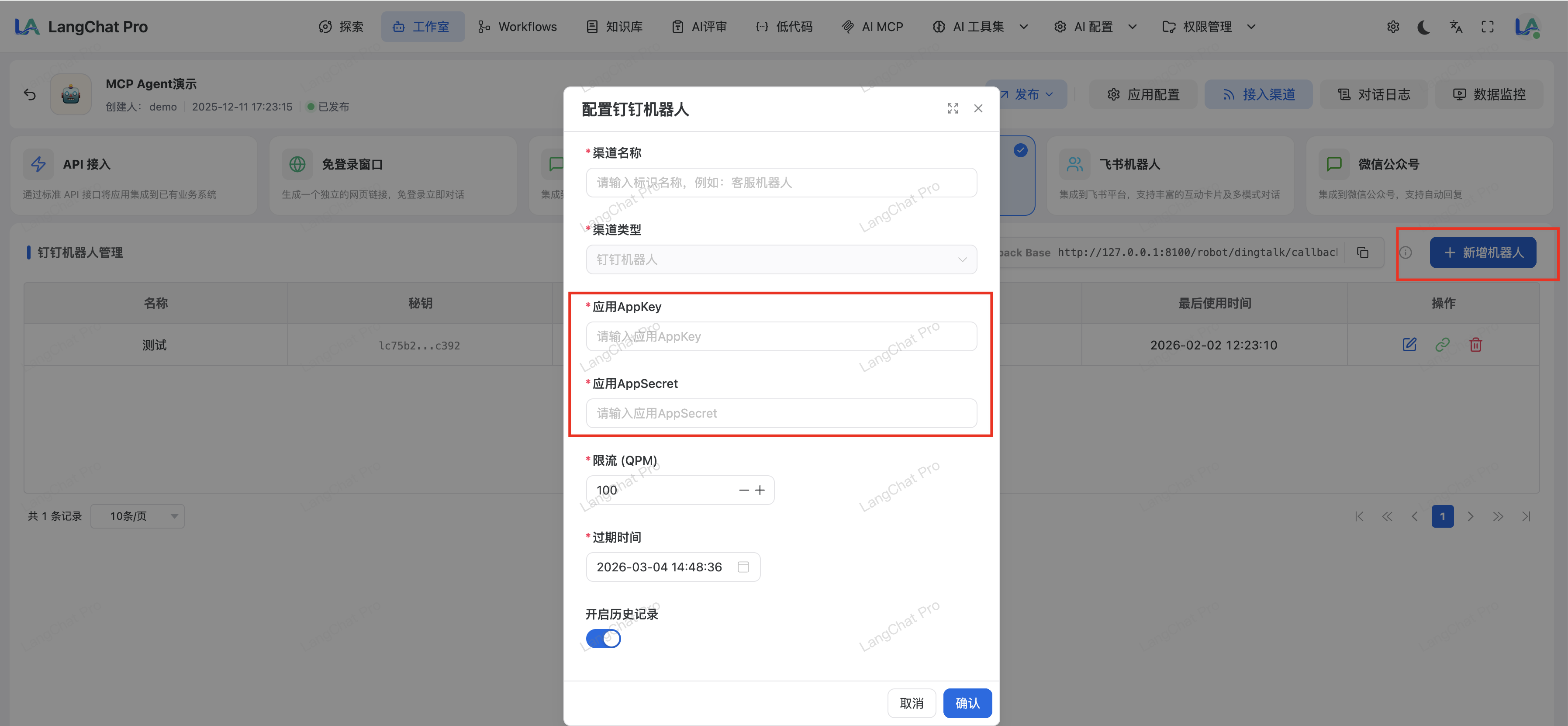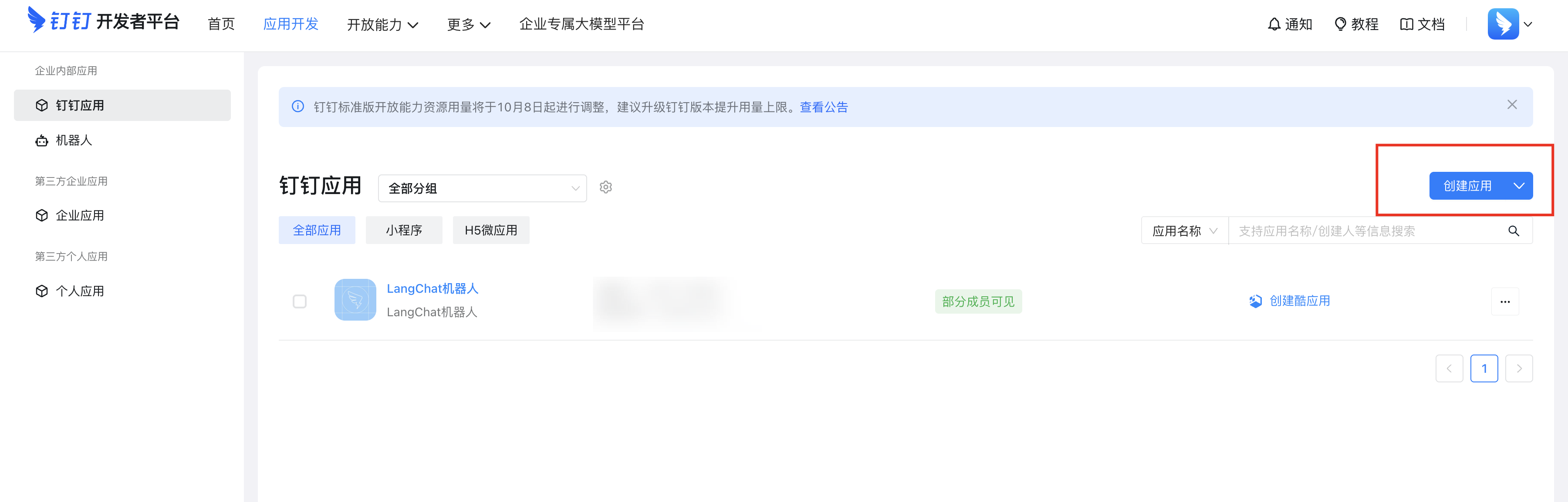 介绍在LangChat 产品中如何把Agent、Workflows对接发布到 “钉钉机器人”,配置完成后,可以在群聊机器人直接跟我们的Agent对话首先你需要在钉钉注册一个企业测试:https://open-dev.dingtalk.com/fe/app