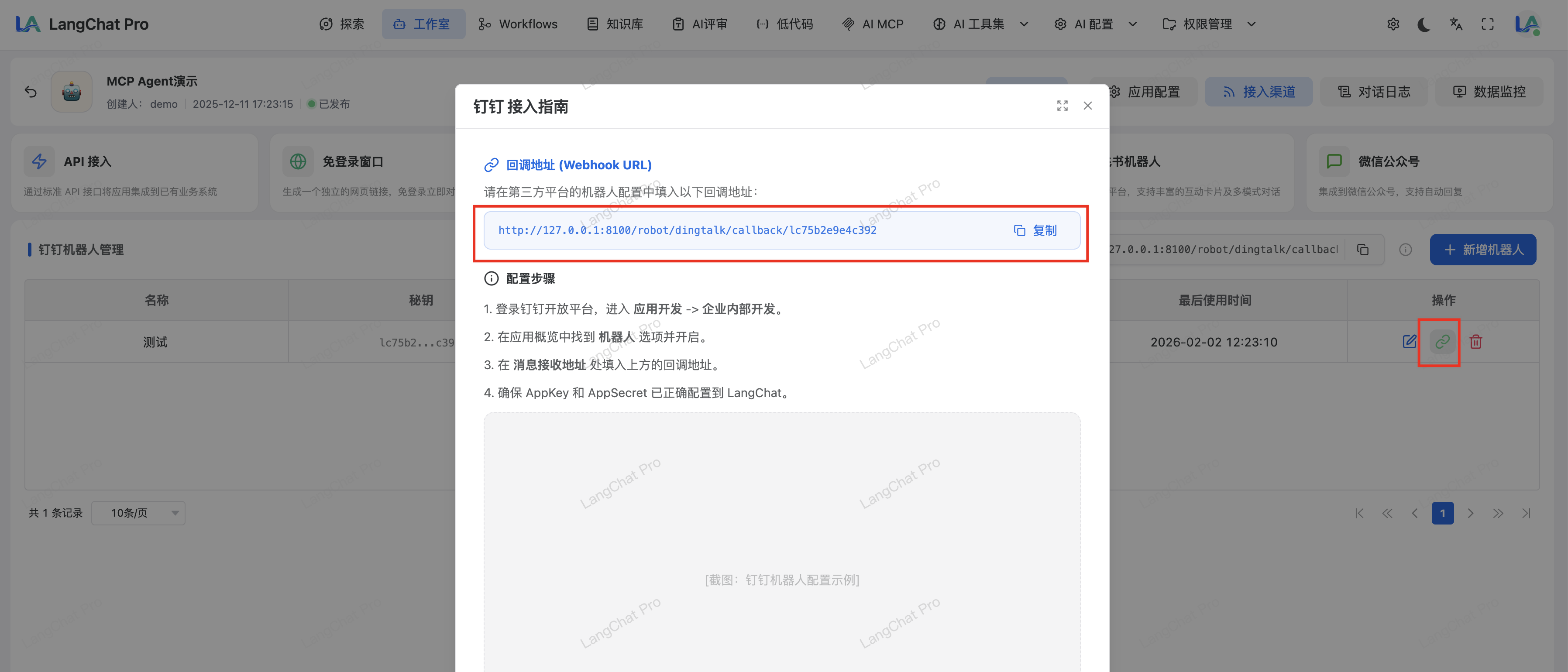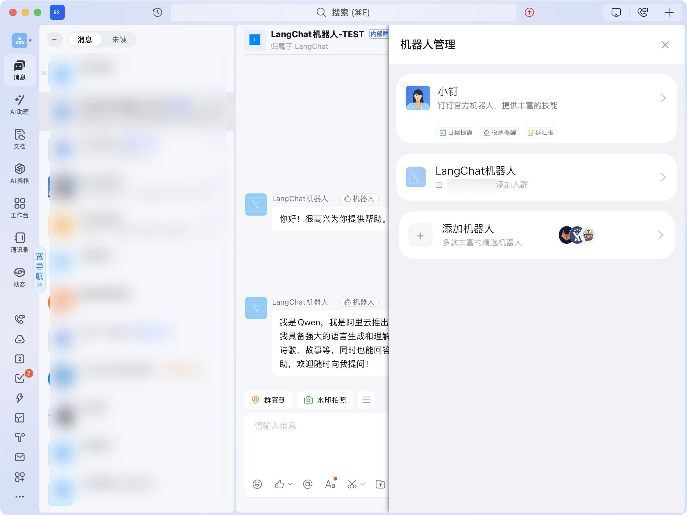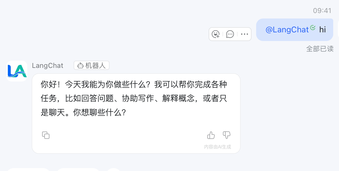 如下,钉钉机器人就成功接入了我们的LangChat Agent应用了。