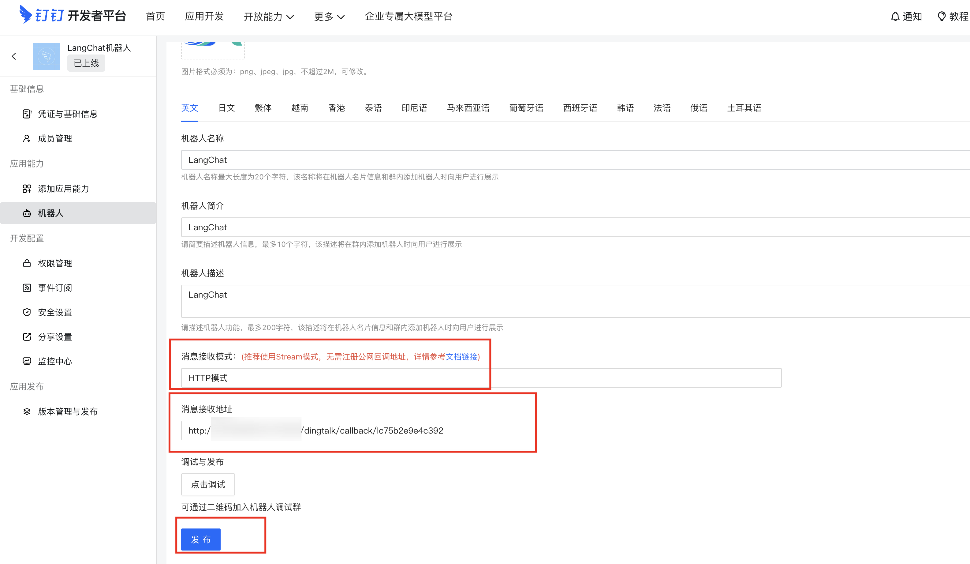 注意:消息接收模式要选择 HTTP模式,接收地址就是填写回调地址。