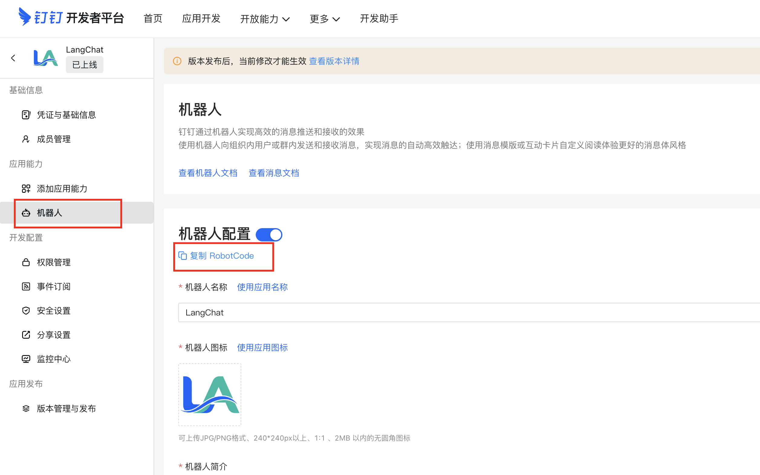 在钉钉的应用后台,配置启用机器人