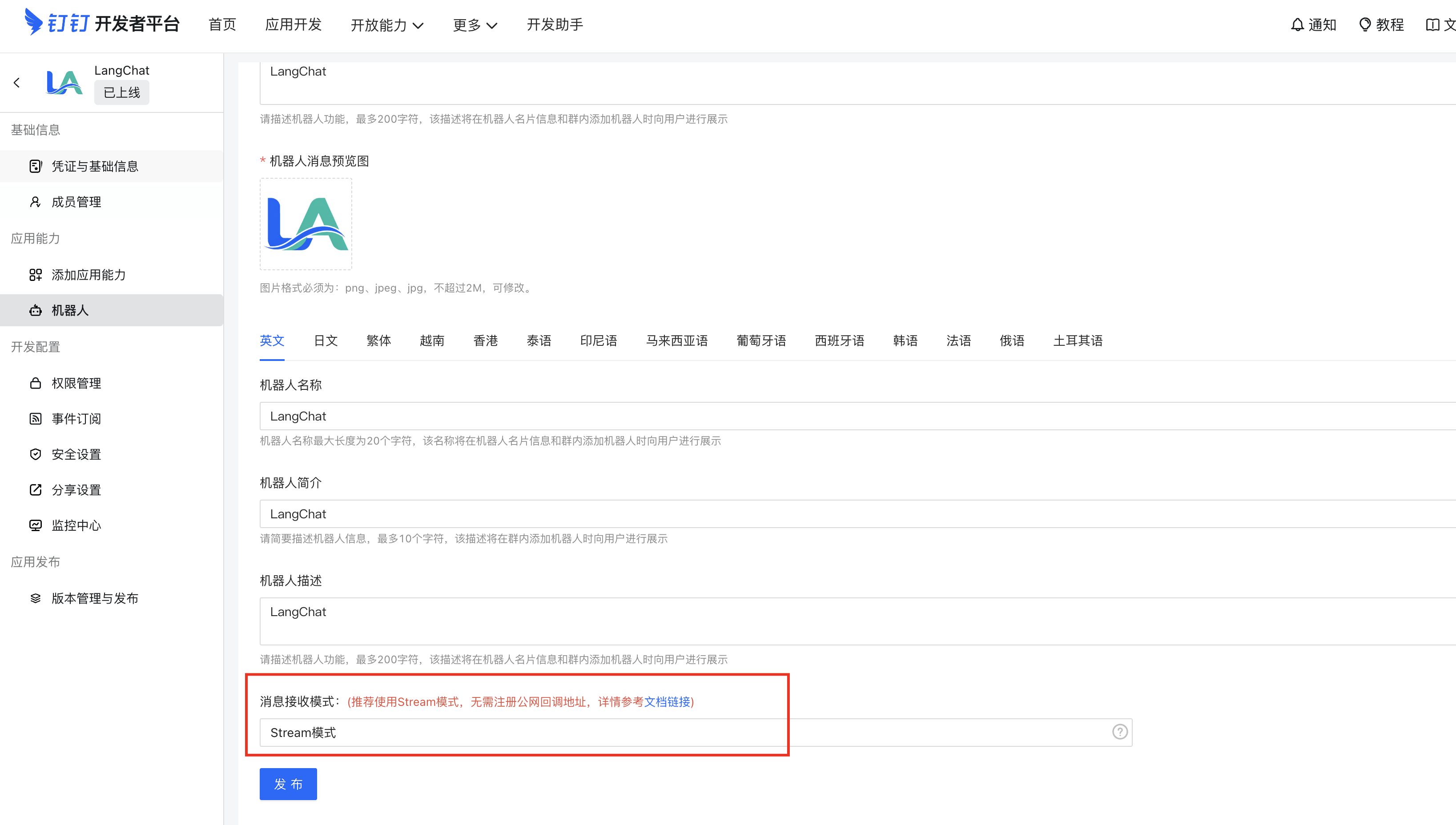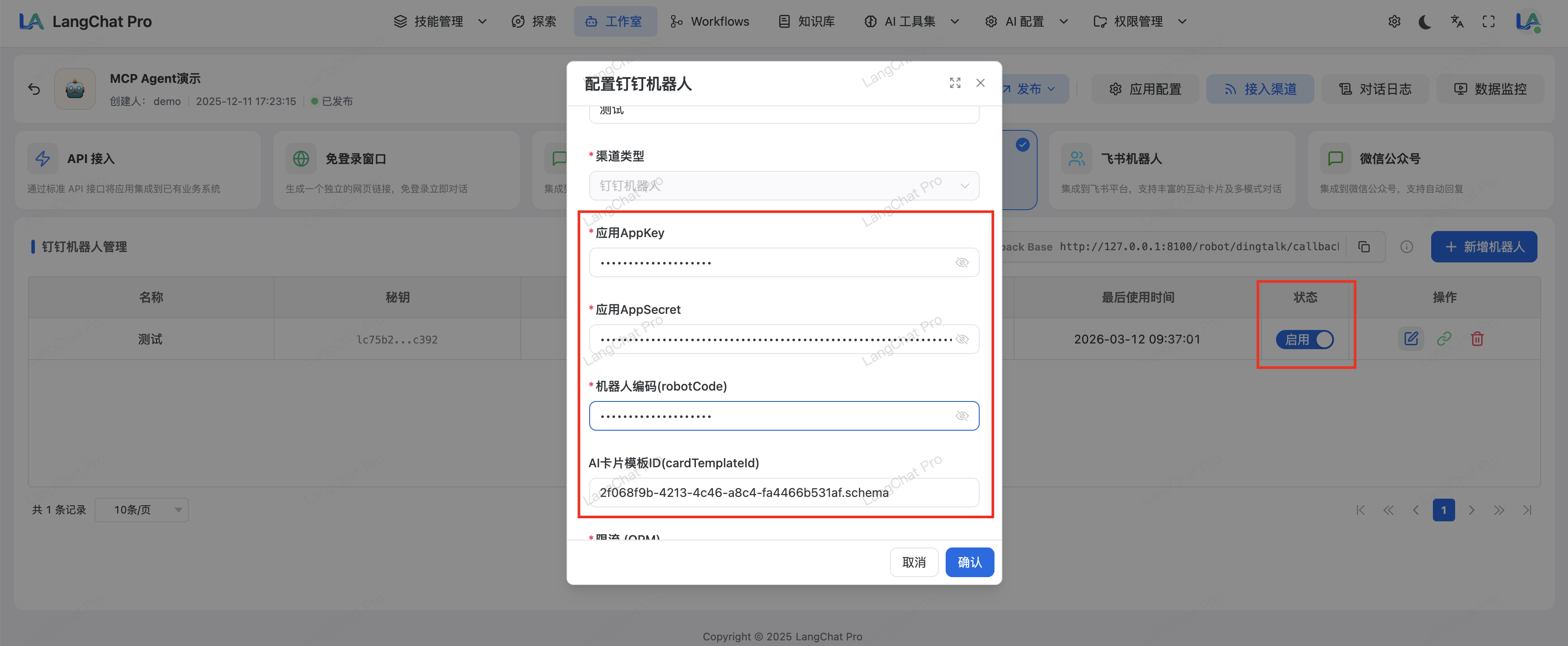9.在LangChat配置钉钉渠道
