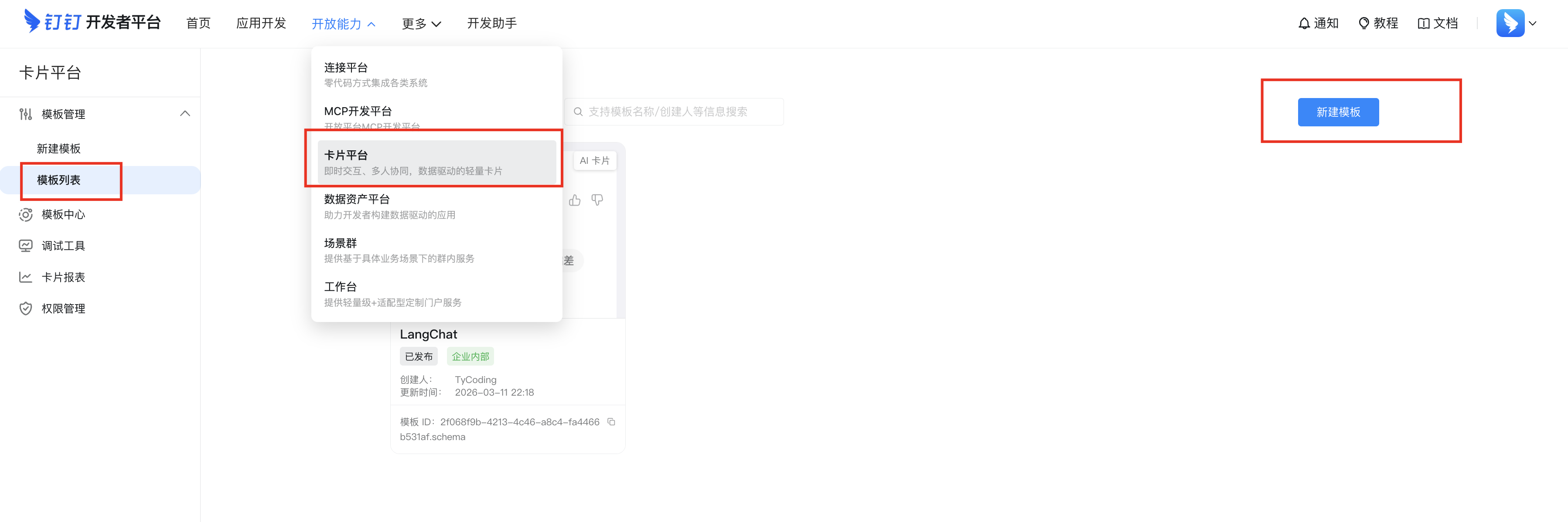注意: 如上创建卡片后要复制 模版ID 字段