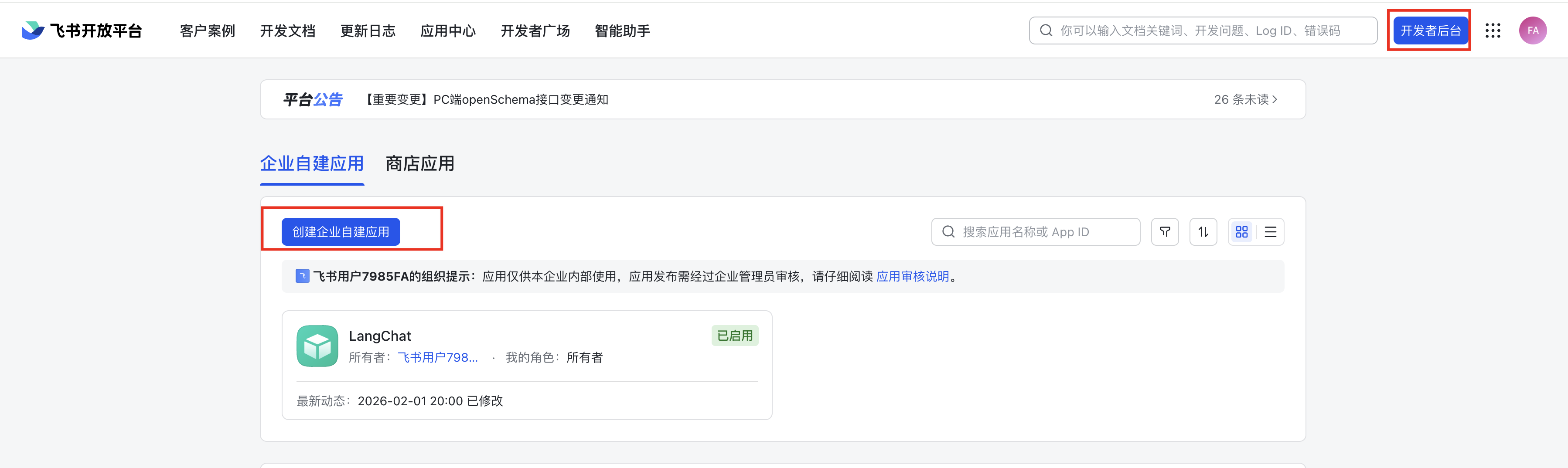 介绍在LangChat 产品中如何把Agent、Workflows对接发布到 “飞书机器人”,配置完成后,可以在群聊里面和飞书机器人直接跟我们的Agent对话首先需要登录飞书开发平台注册开发者账号:https://open.feishu.cn/app?lang=zh-CN