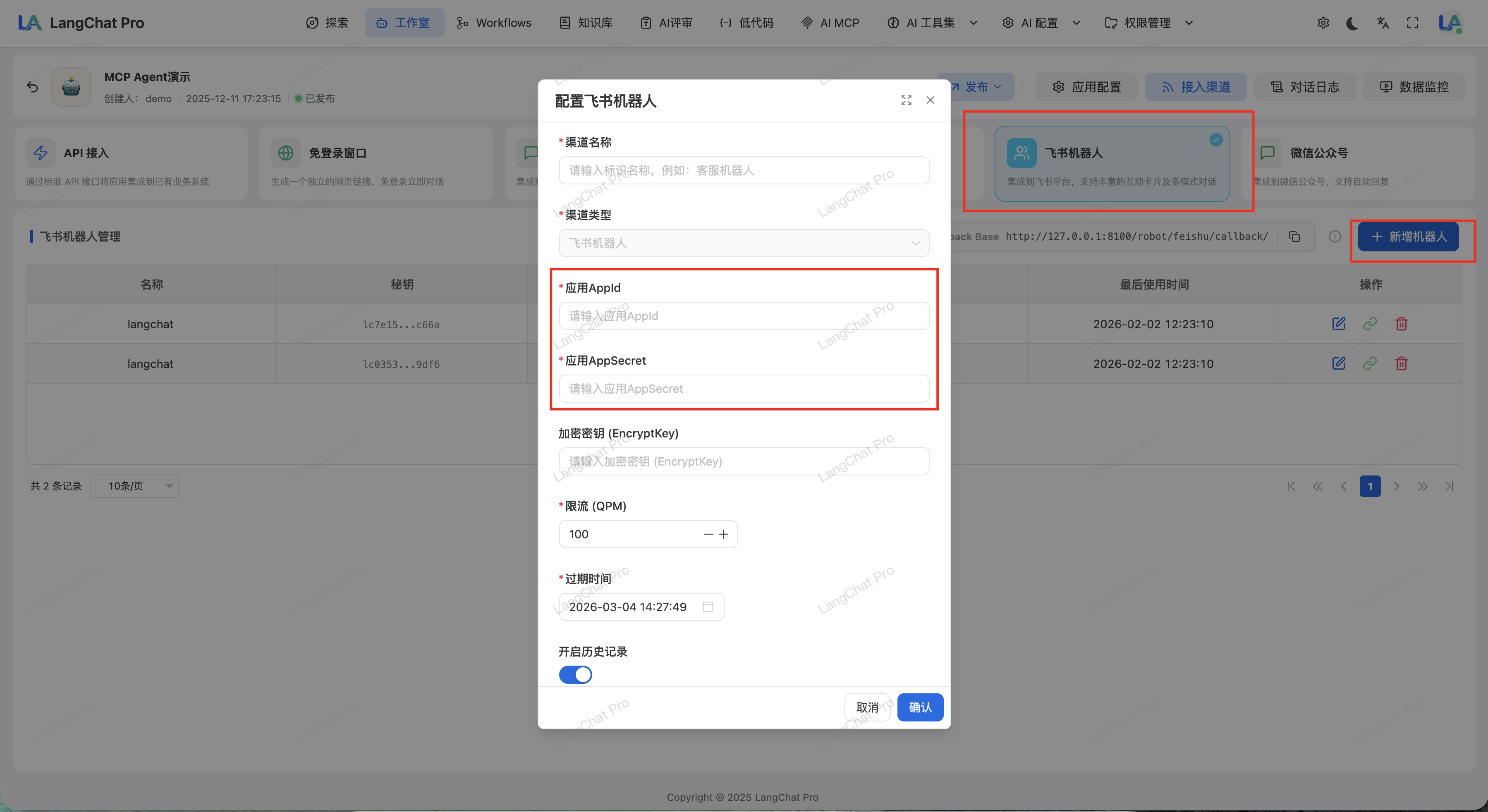有了上面两个参数,我们需要先在LangChat配置这个渠道,拿到回调地址