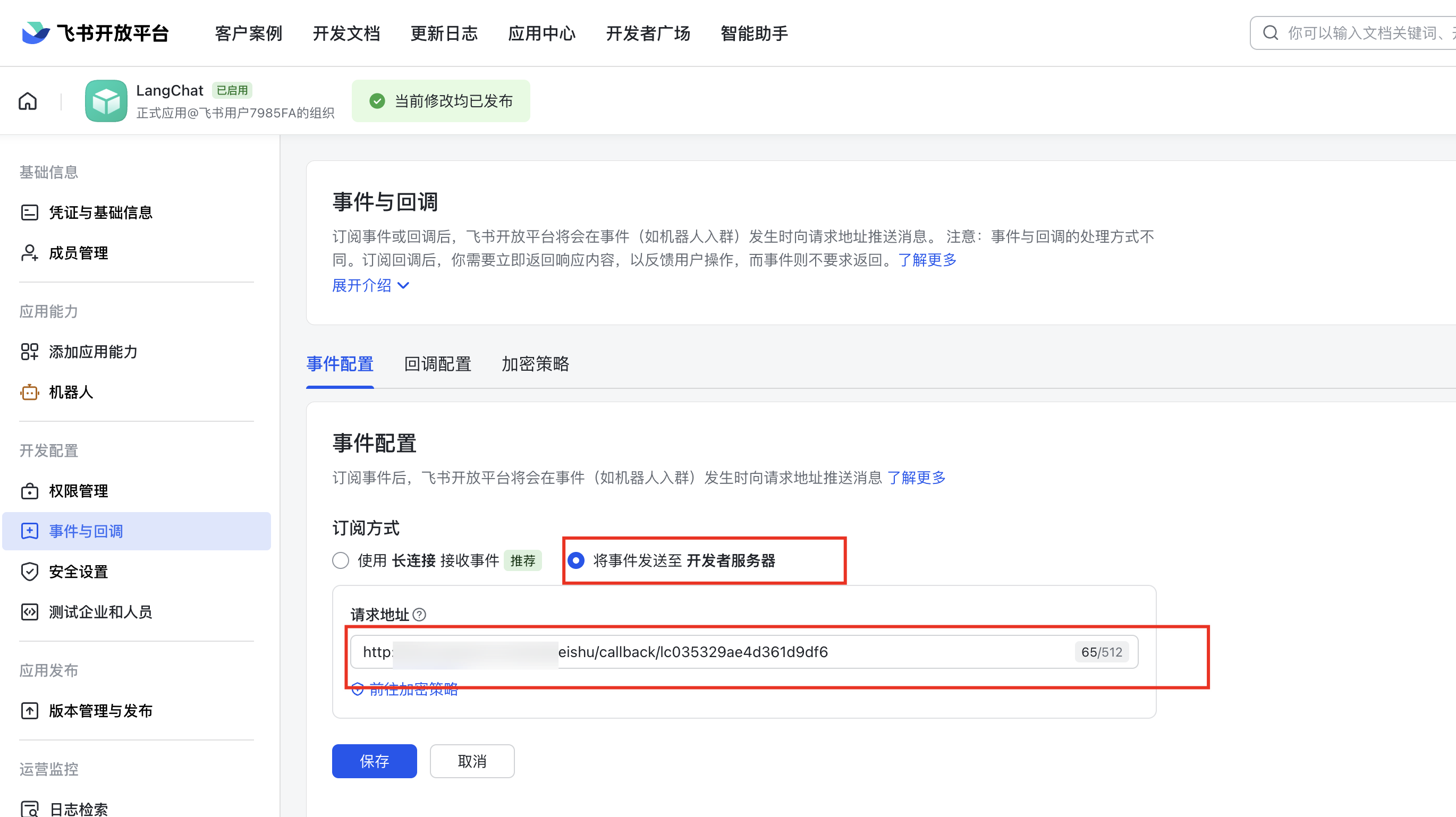 在事件与回调中配置订阅方式,选择 将事件发送到开发者服务器
