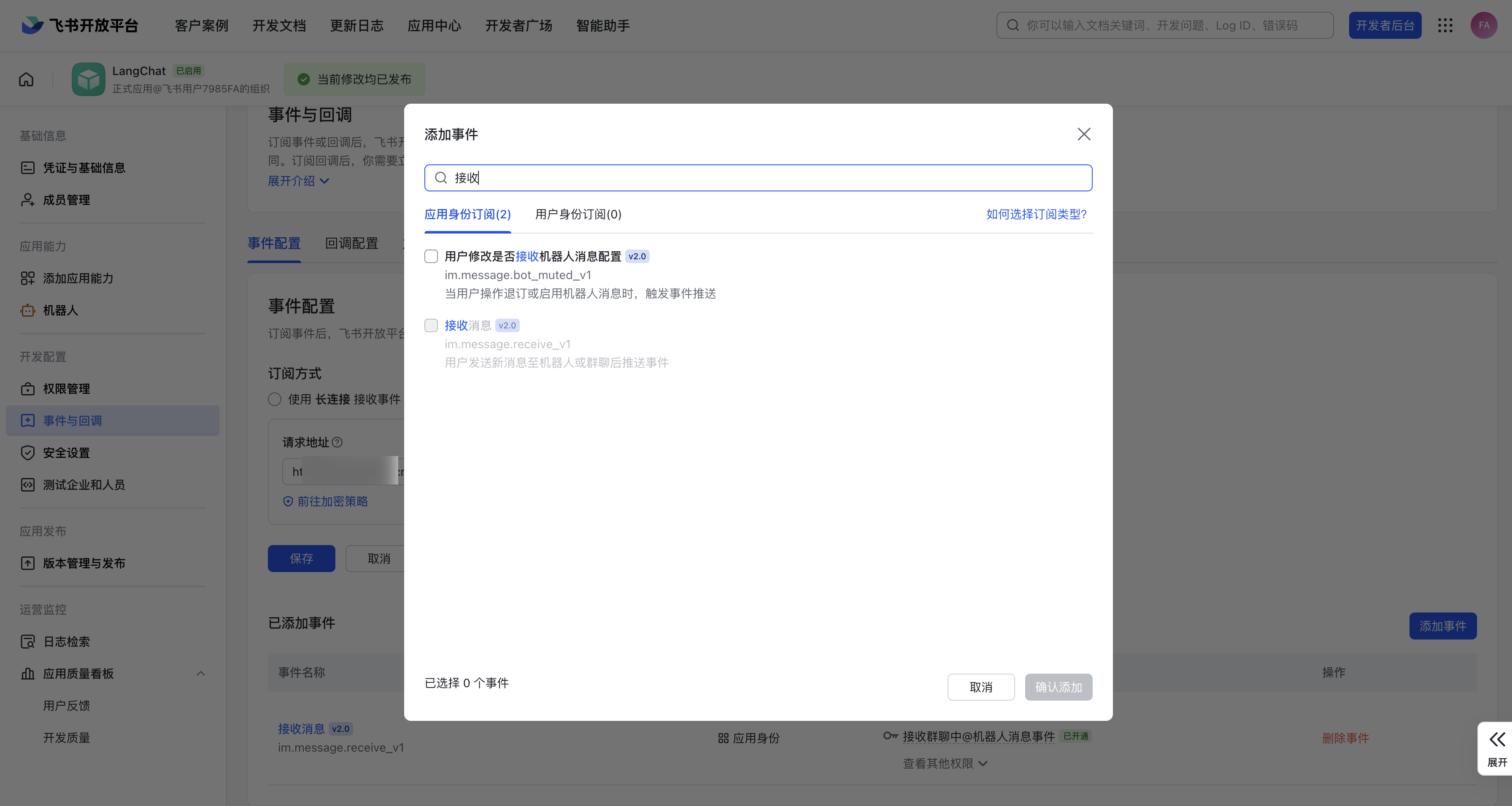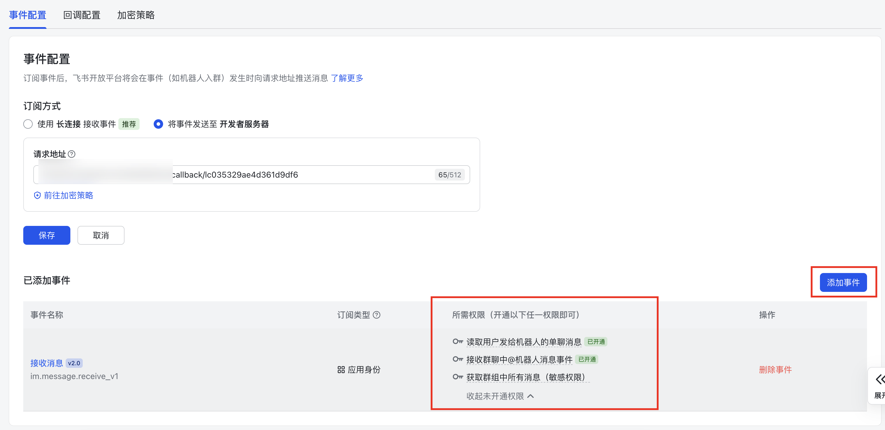 飞书的这个事件涉及了三个权限:- 读取用户发给机器人的单聊消息