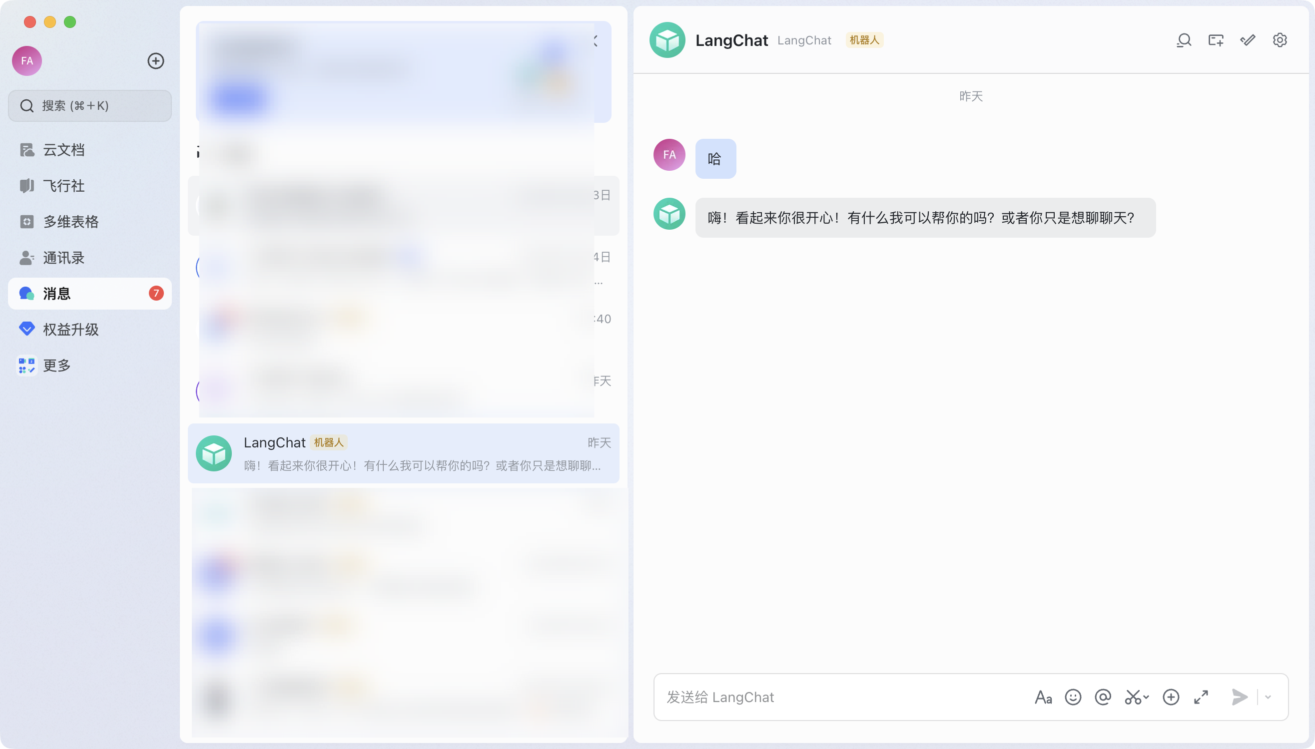 如下,飞书机器人就成功接入了我们的LangChat Agent应用了。