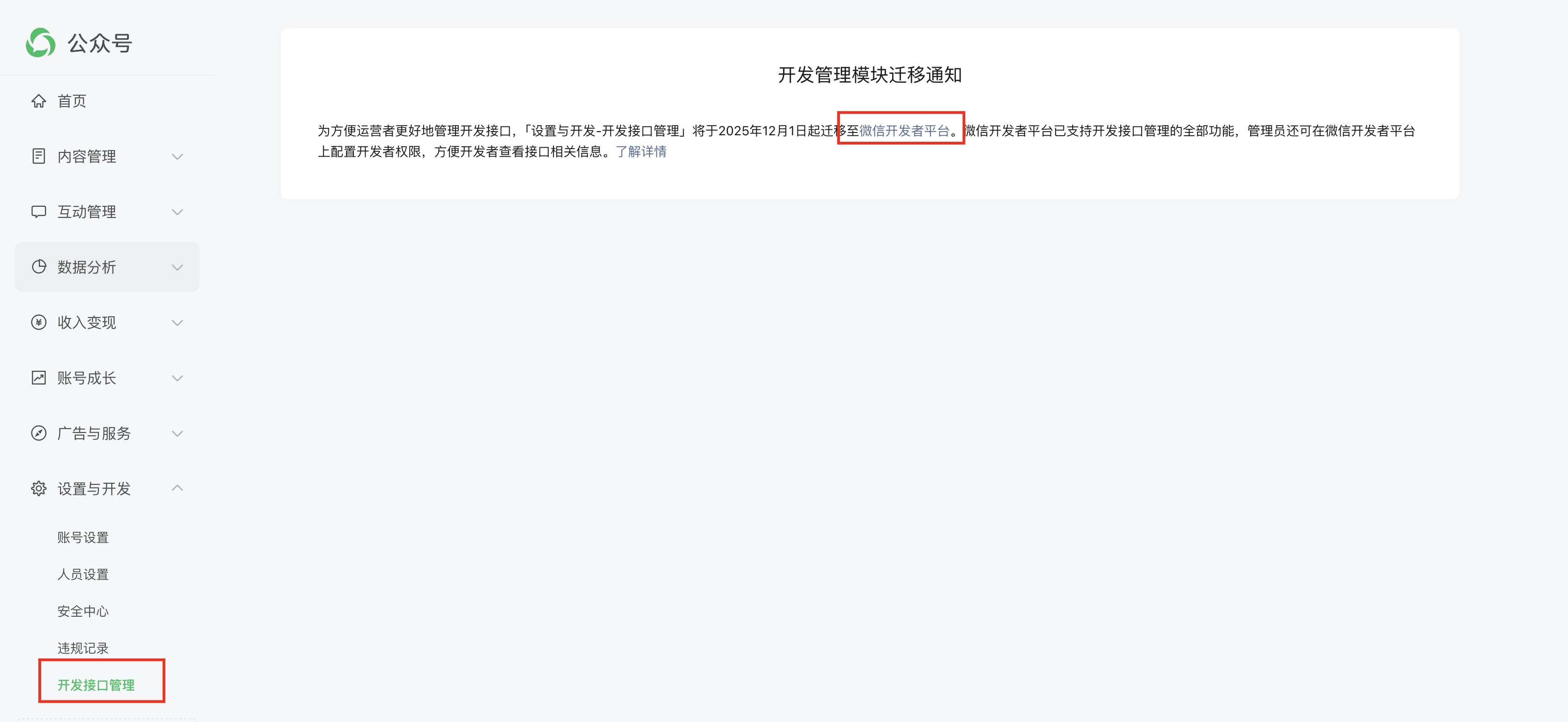 介绍在LangChat 产品中如何把Agent、Workflows对接发布到 “微信公众号”,配置完成后,可以在公众号对话页面直接跟我们的Agent对话需要提前注册好实名通过的公众号,这里仅演示“公众号”的接入教程。 首先你需要登录微信公众号后台:https://mp.weixin.qq.com/