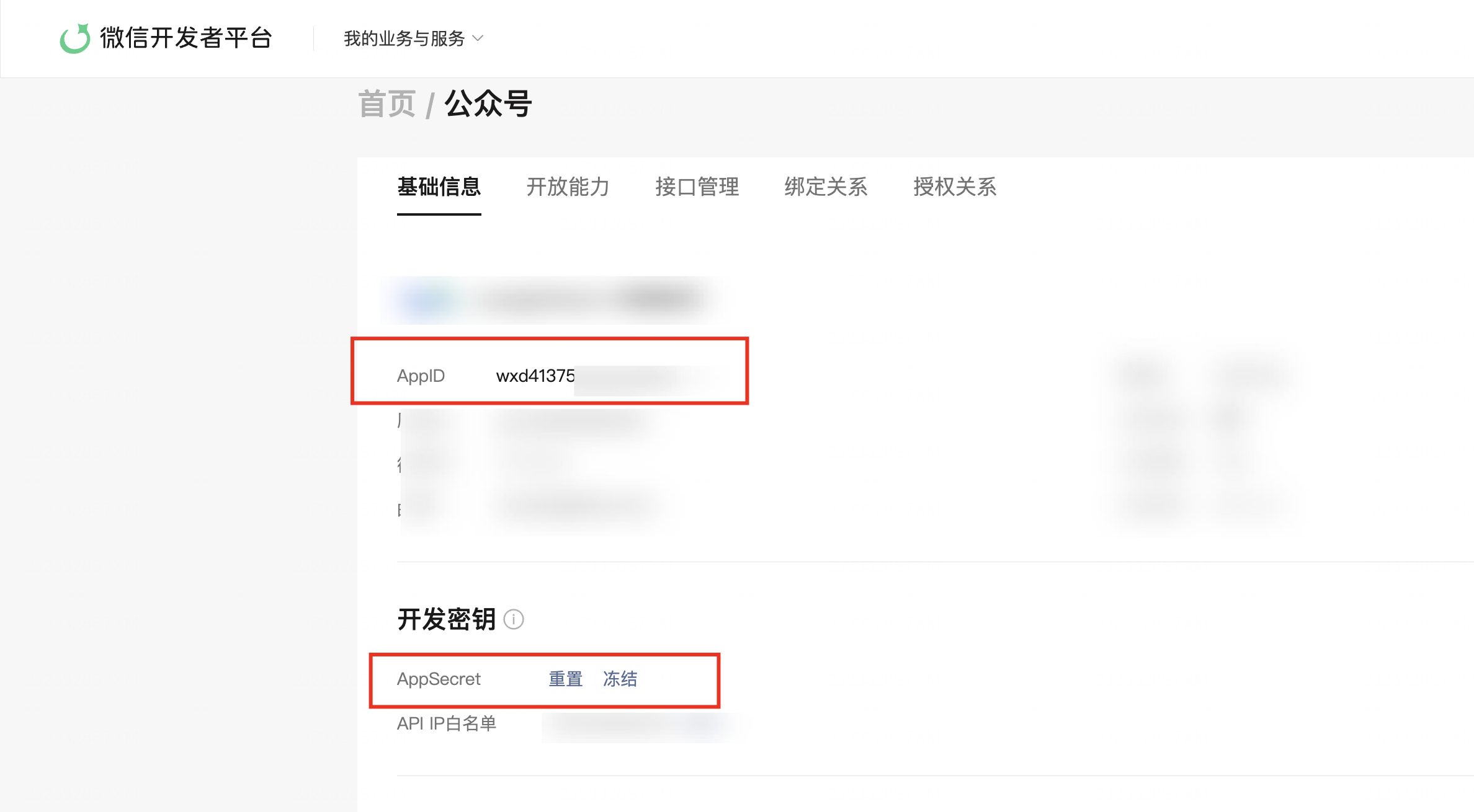 点击AppSecret的 “重置/设置” 功能,设置后可以拿到 AppID 和 AppSecret 两个参数: