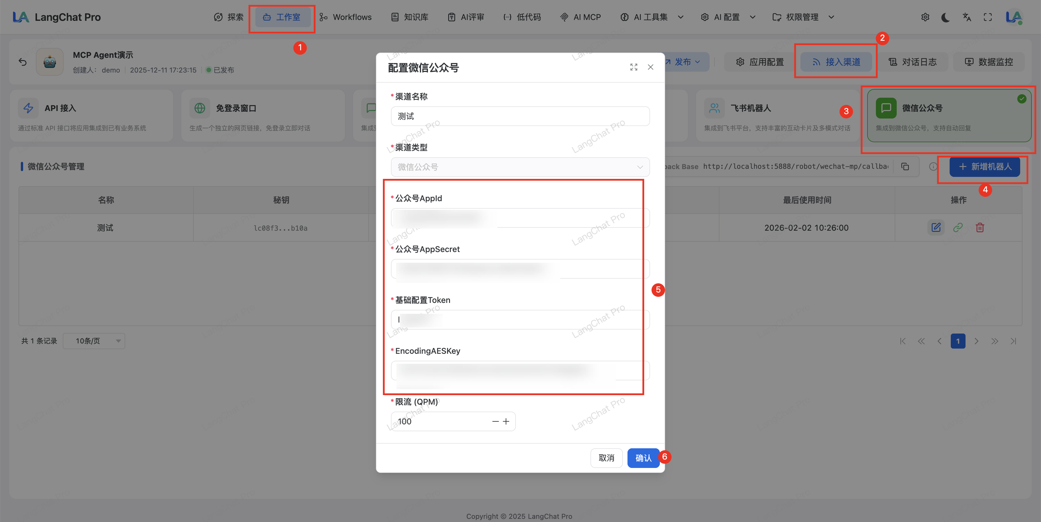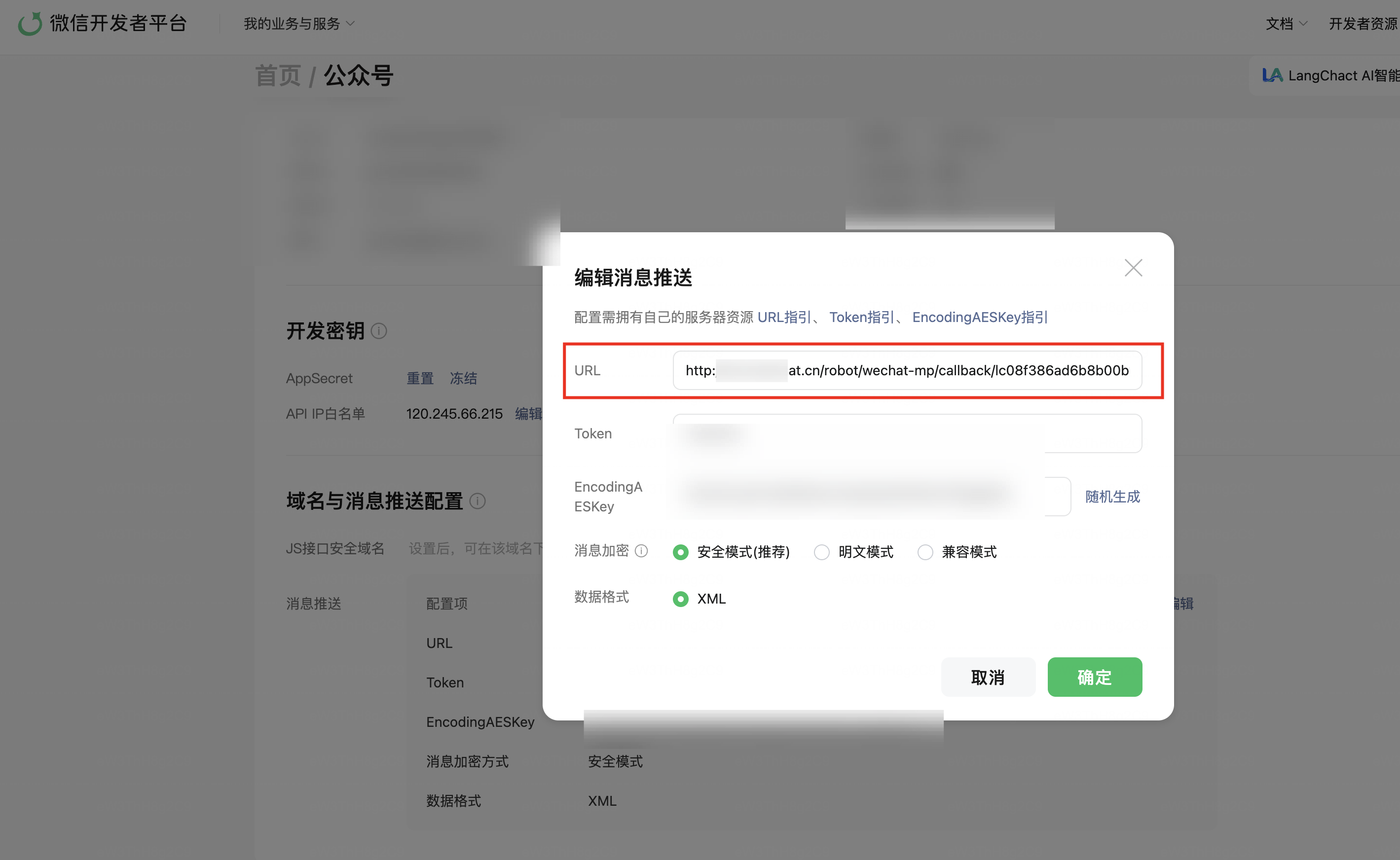 注意:URL需要从LangChat中获取微信公众号的回调地址(携带了key)