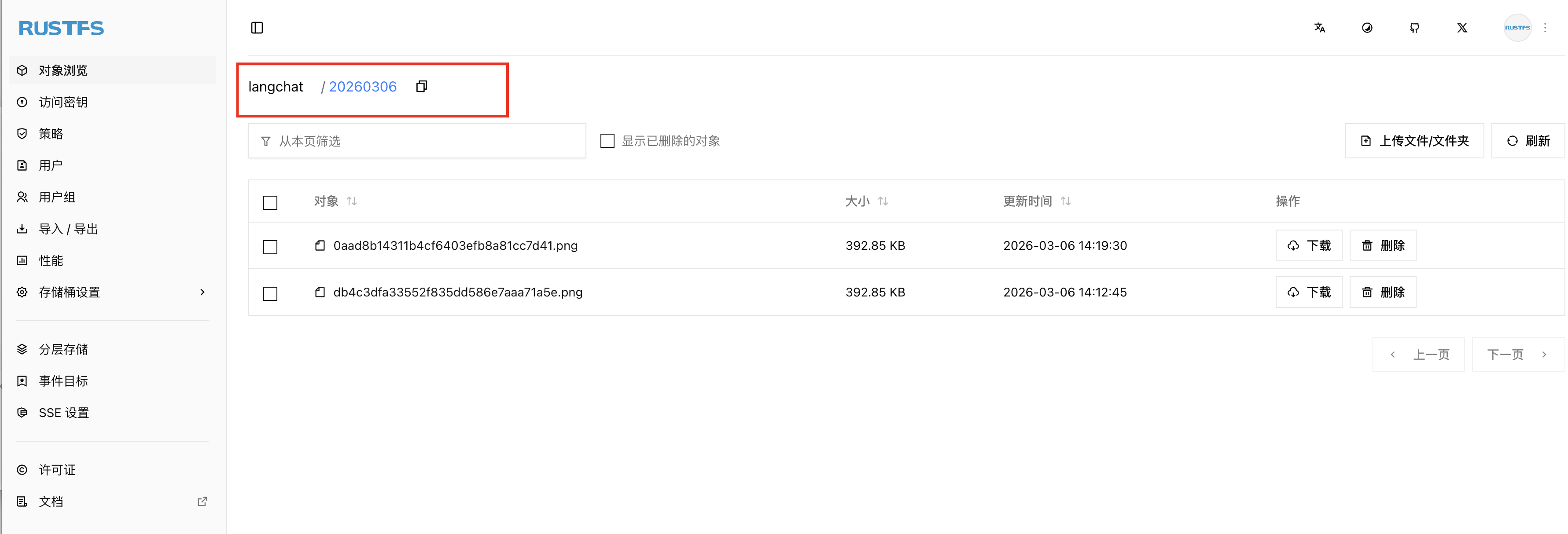 注意:一旦出现文档上传失败,或者上传后的链接无法通过浏览器访问,首先排查后端日志,然后对比RustFS的链接地址,检查是否哪个路径配置错误