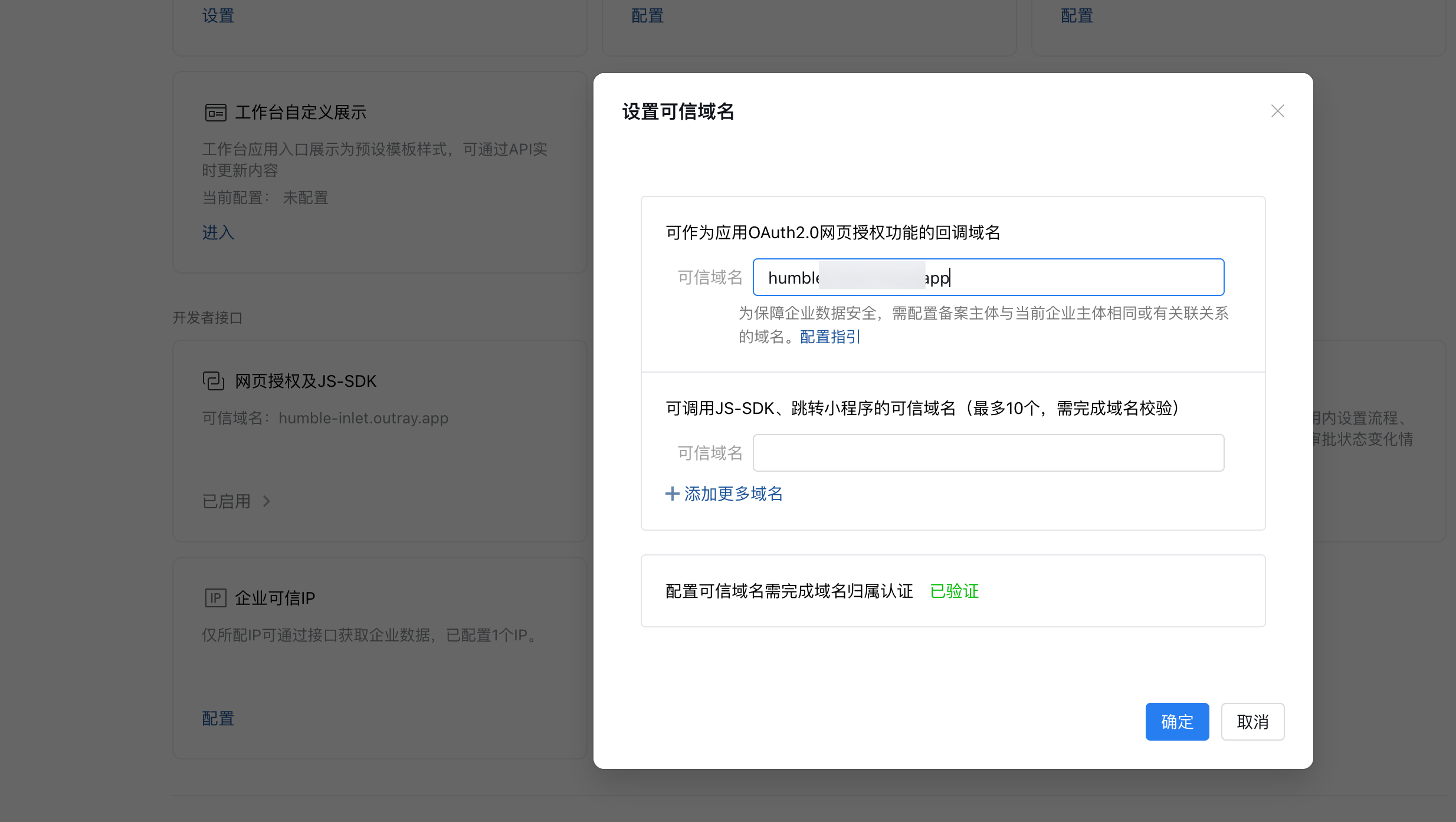注意:如上三个位置配置域名和信任IP,这里只需要配置域名即可不需要配置具体的回调地址 其中,信任IP是当前项目所在的公网/局域网IP地址(如果没有配置,后端授权会报错返回IP)