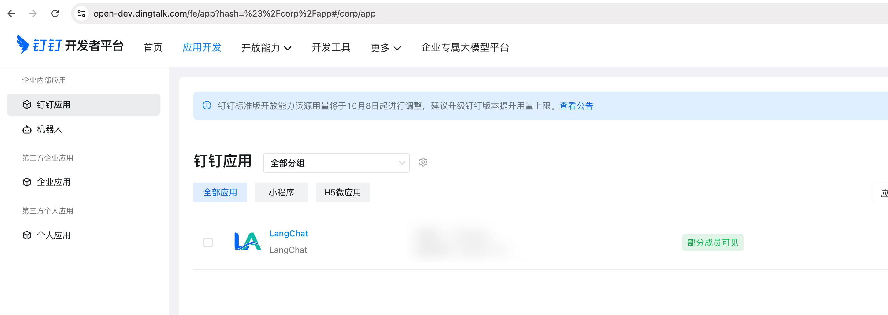 - 进入「应用开发」→「企业内部应用」→「钉钉应用」