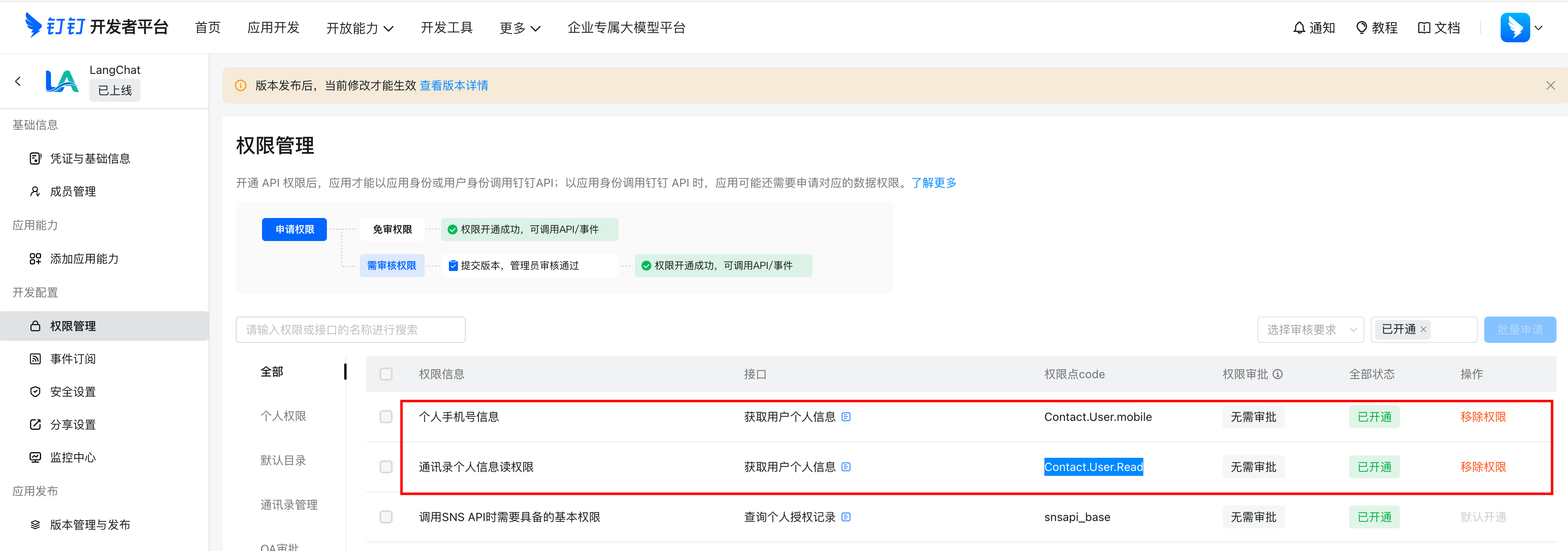 在「权限管理」中申请以下权限:Contact.User.mobileContact.User.Read