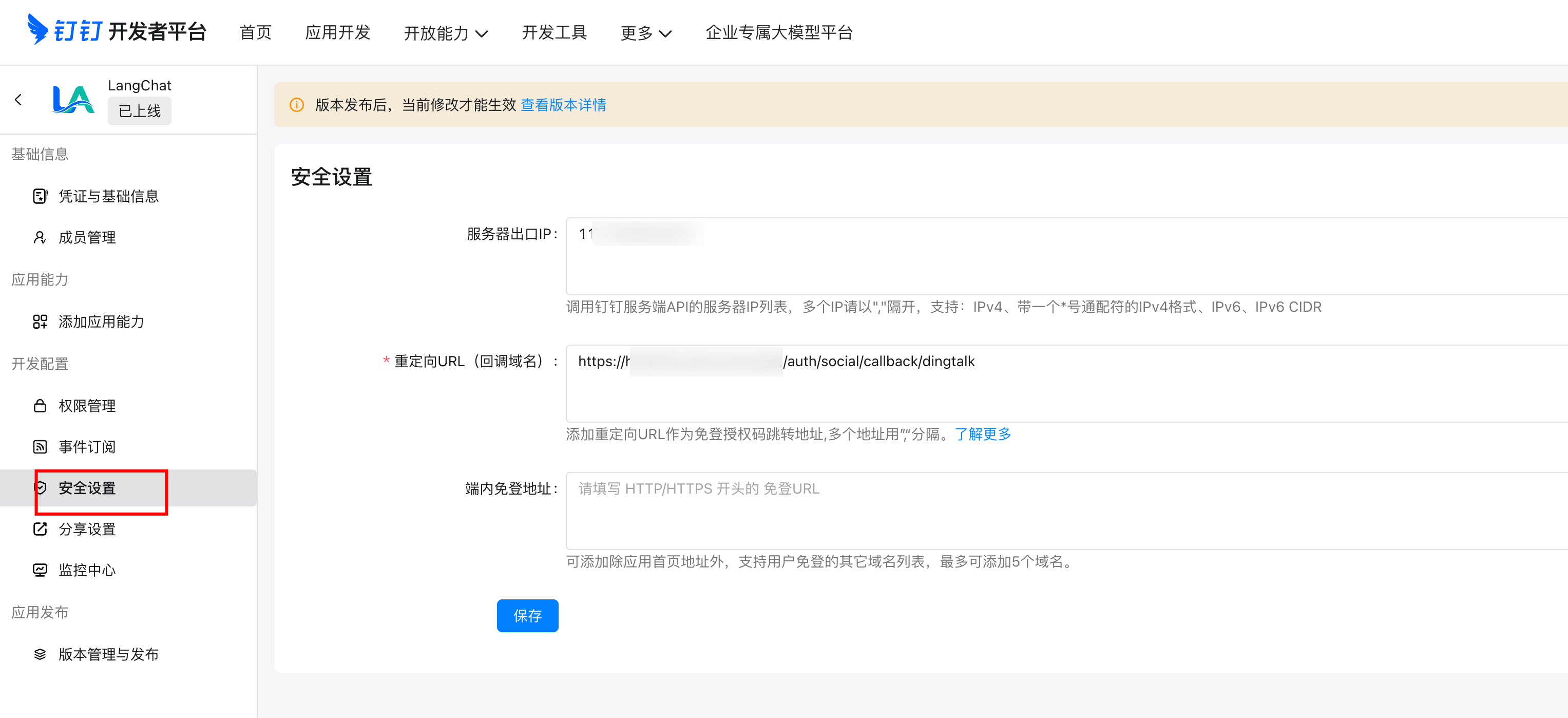 - 进入「钉钉应用」→「开发配置」→「安全配置」