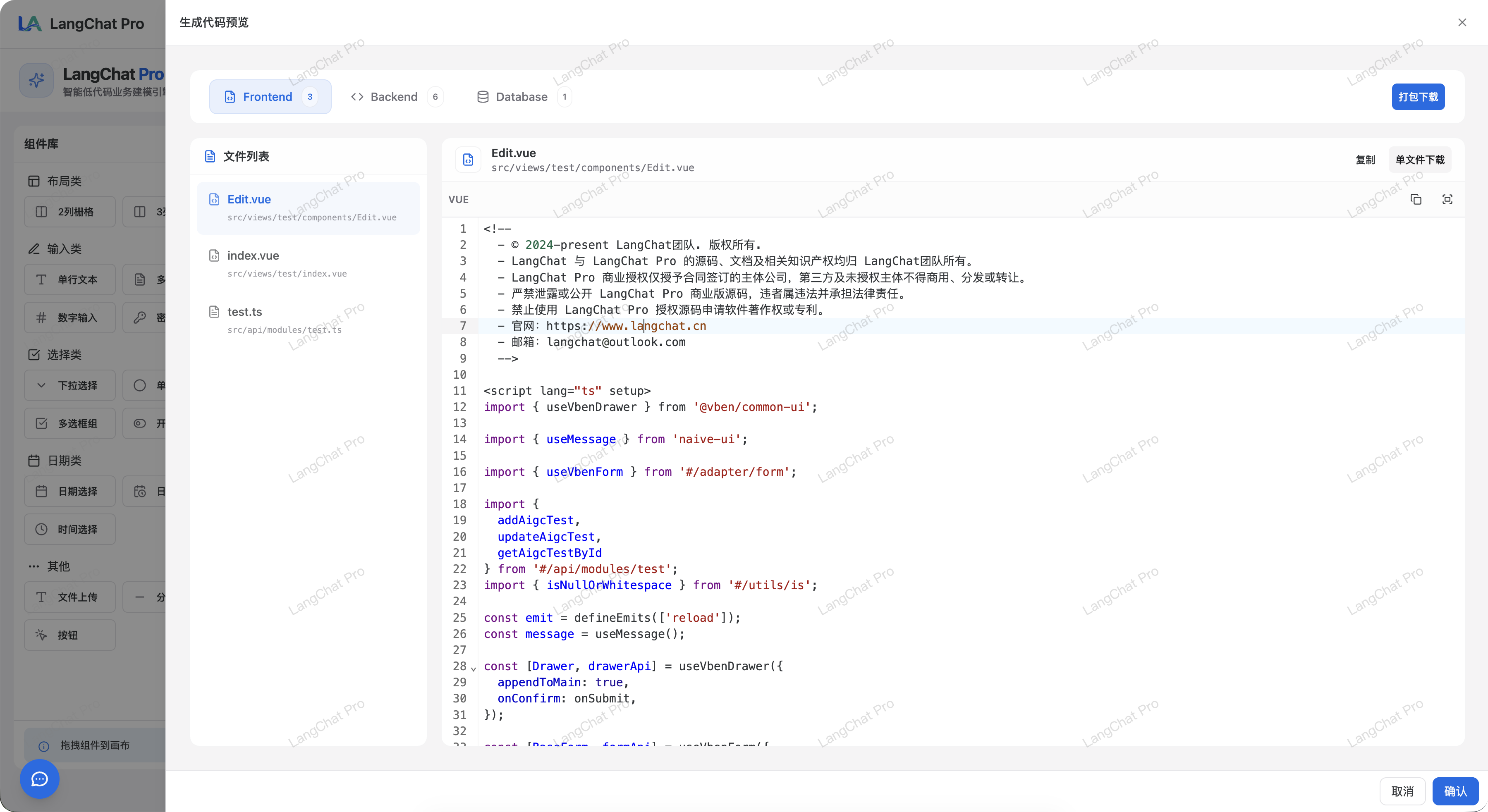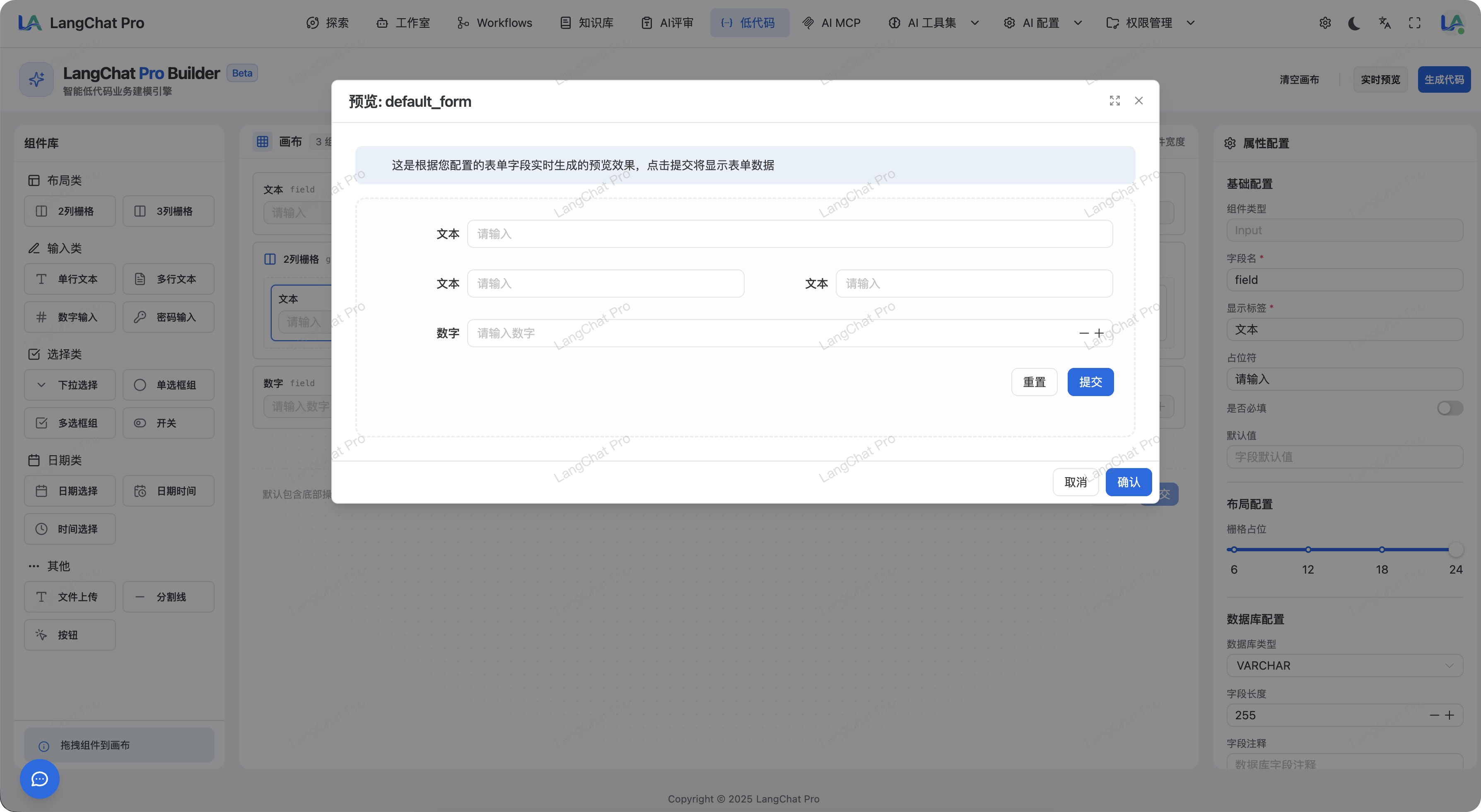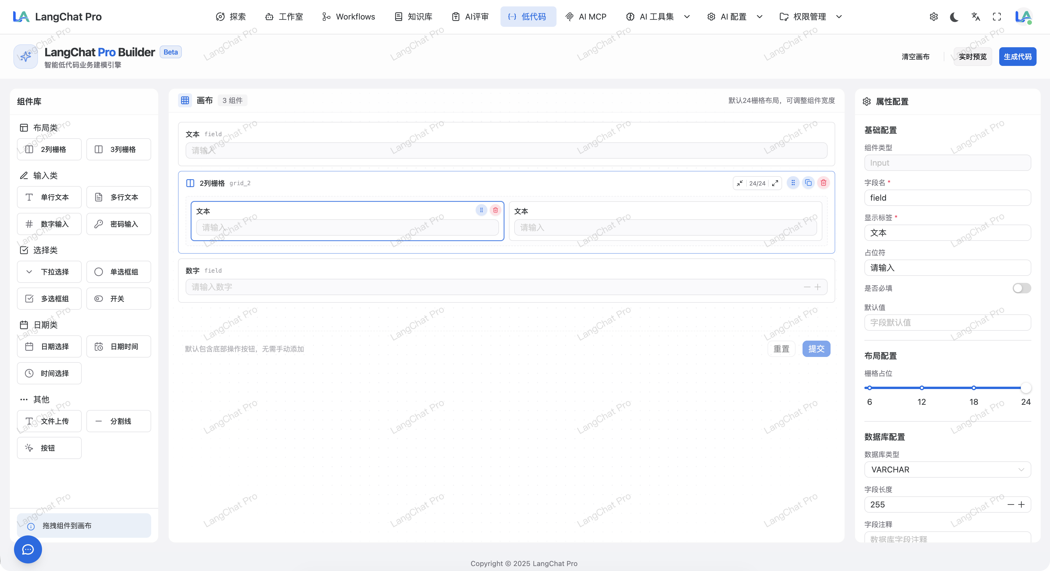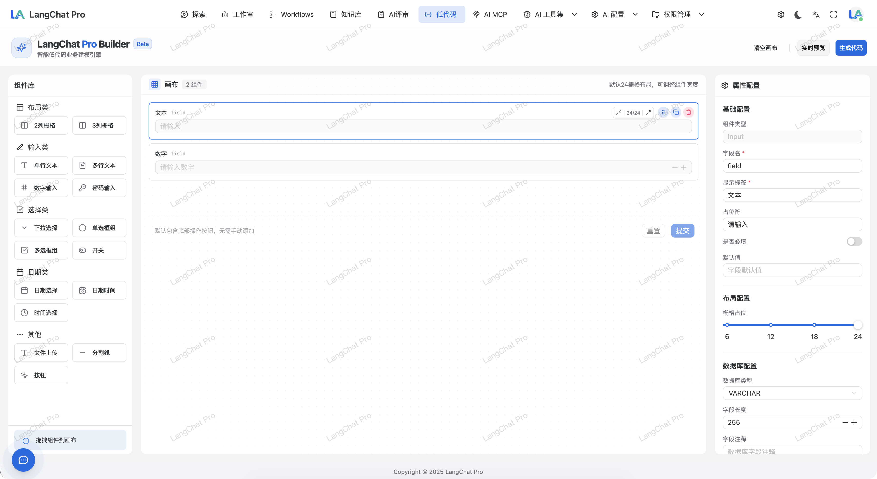 LangChat Pro 内置低代码平台,通过可视化拖拽方式快速构建表单并生成完整代码。主要功能包括:- 可视化构建:拖拽组件至画布,快速搭建表单