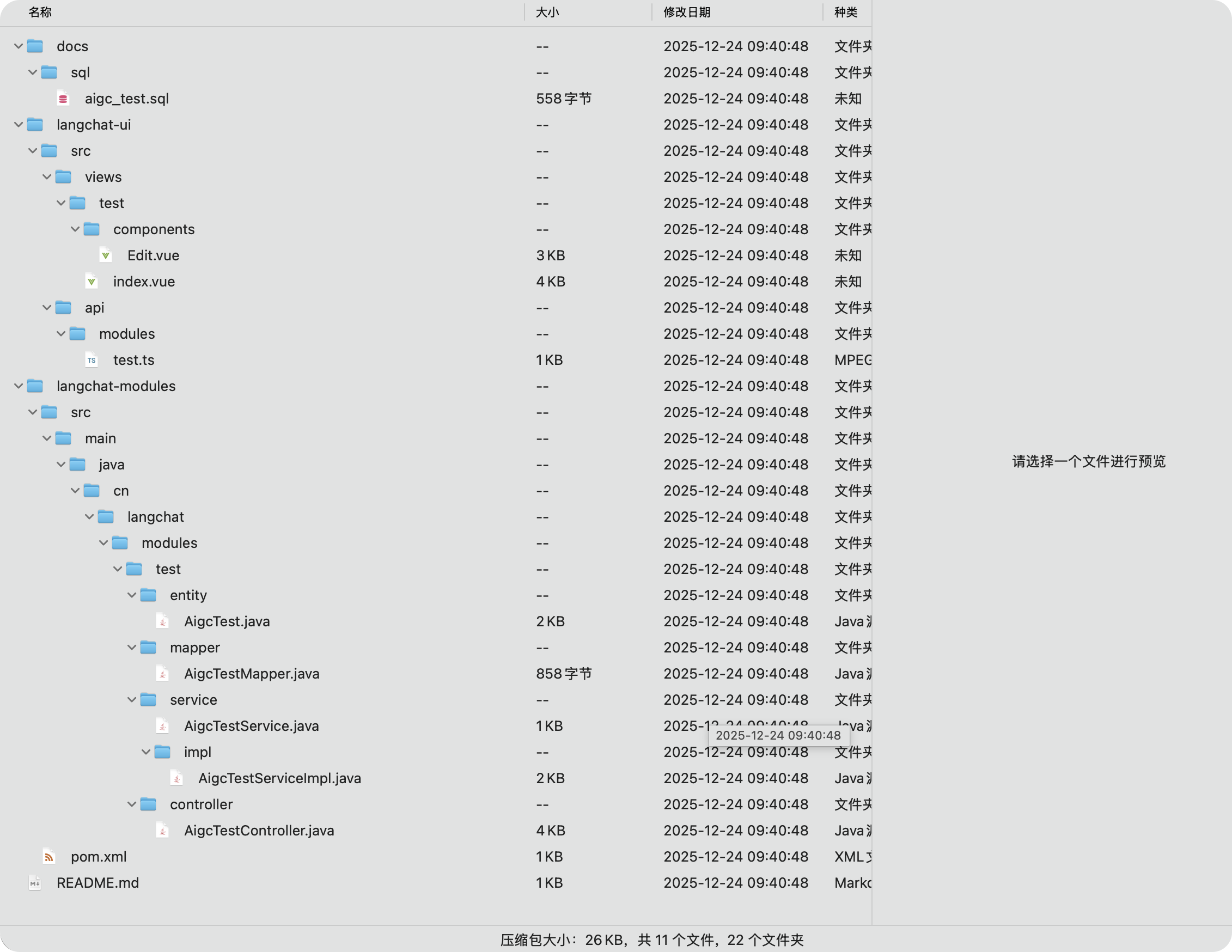 系统按照配置的包名和类名,生成完整代码包并自动下载。 下载内容包括:- 后端代码