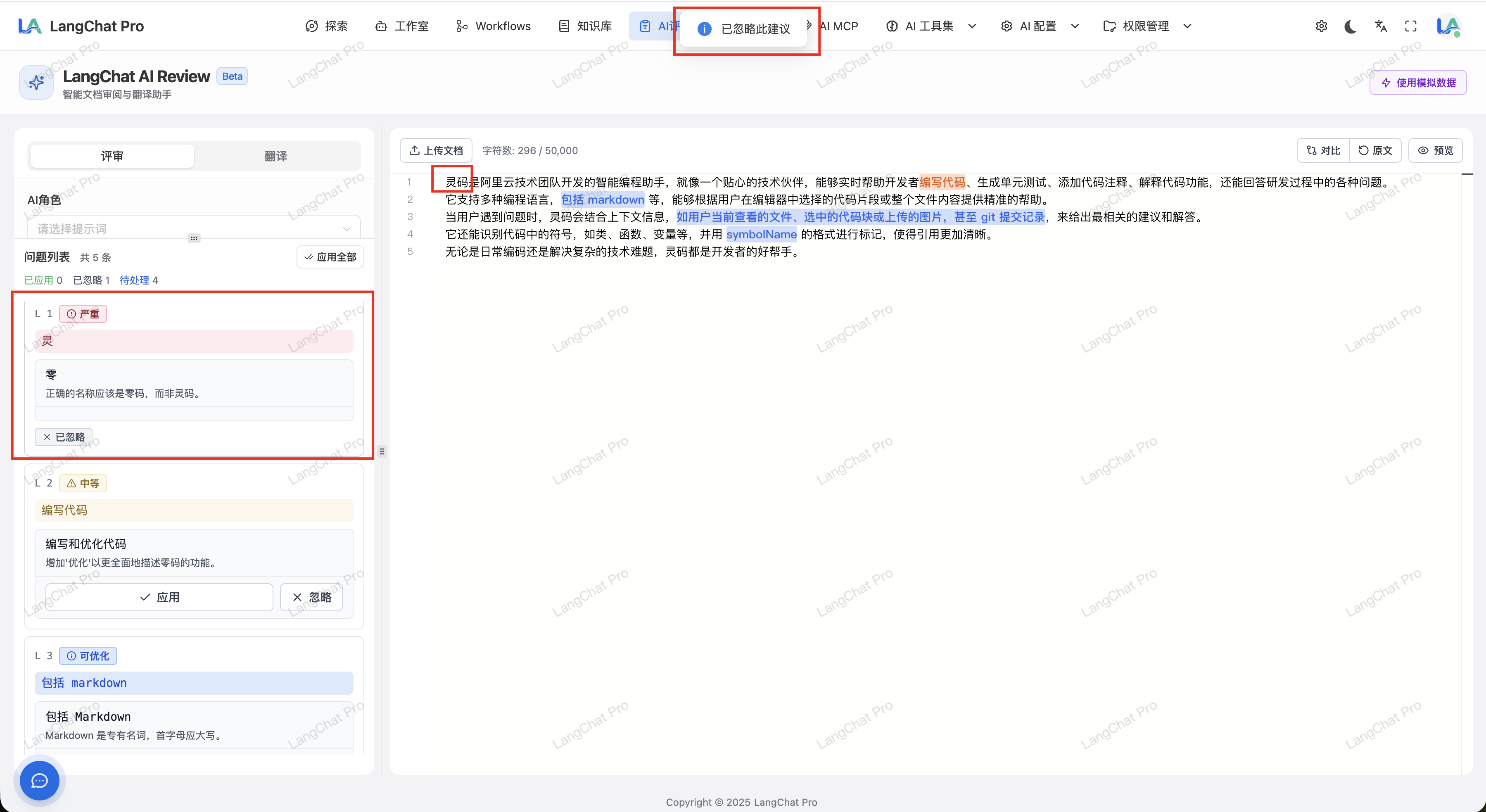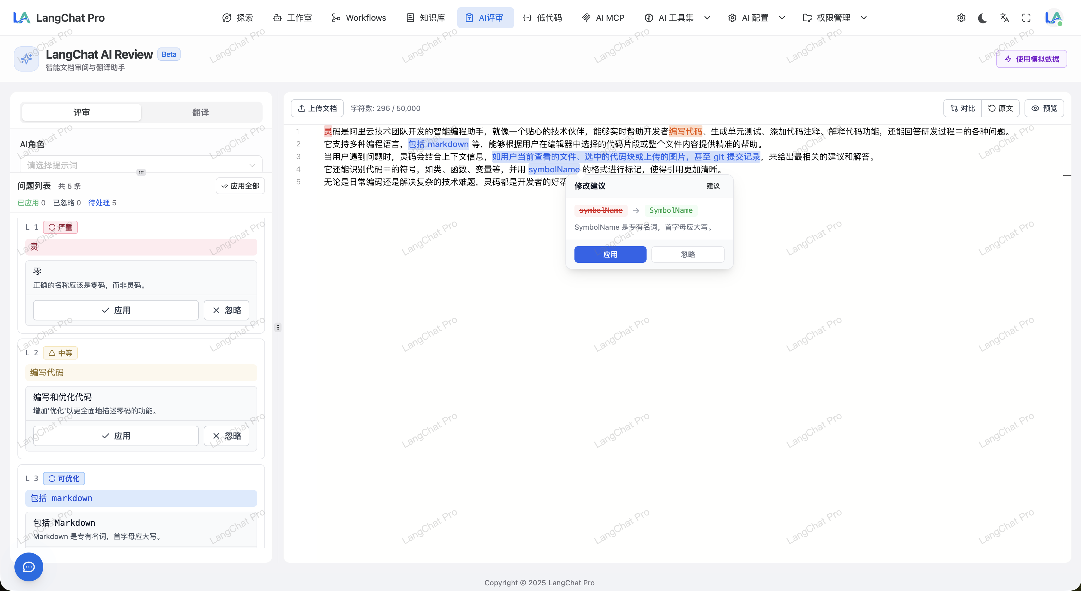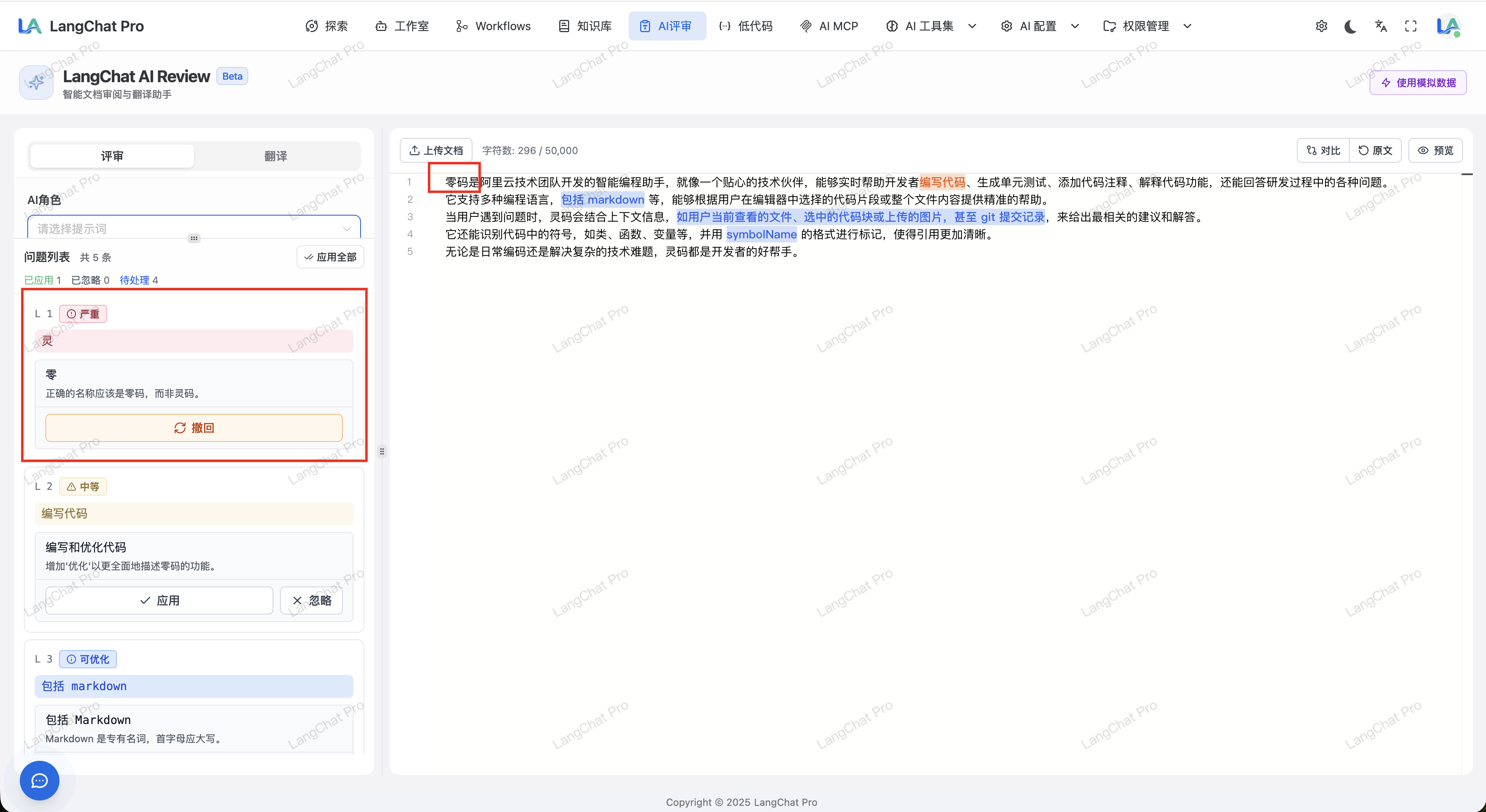 - AI 评审:AI 阅读全量文档内容,根据提示词配置评审文档语言中可能存在的不规范用语,并提供修改建议