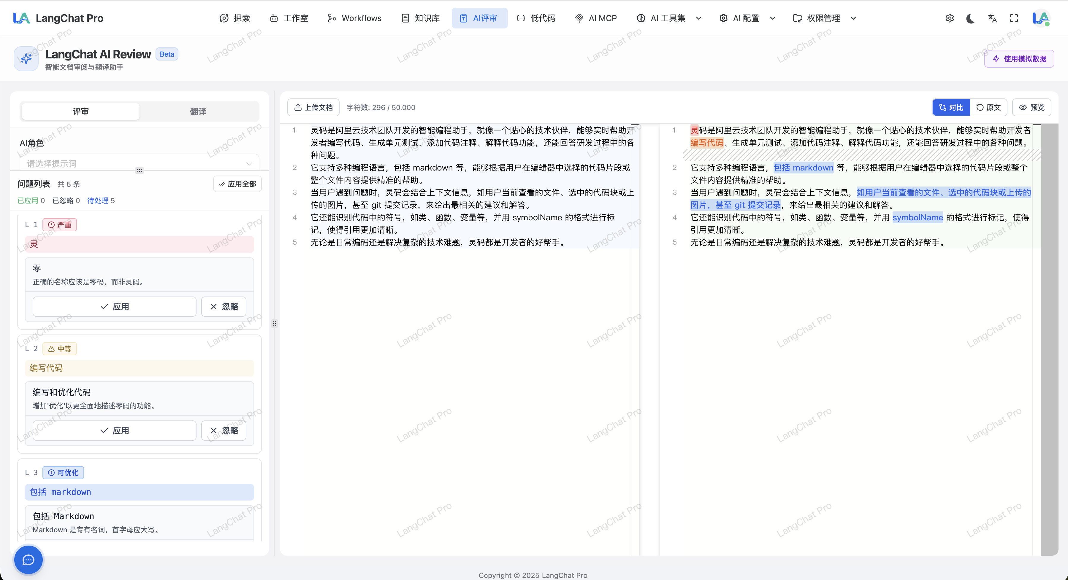 对于 AI 评审功能,系统通过提示词约定 AI 按照固定的 JSON 格式返回修改建议信息。小模型或私有化部署模型可能无法保证响应内容符合 JSON 规范,导致功能不可用。建议配合更强的 AI 模型使用。