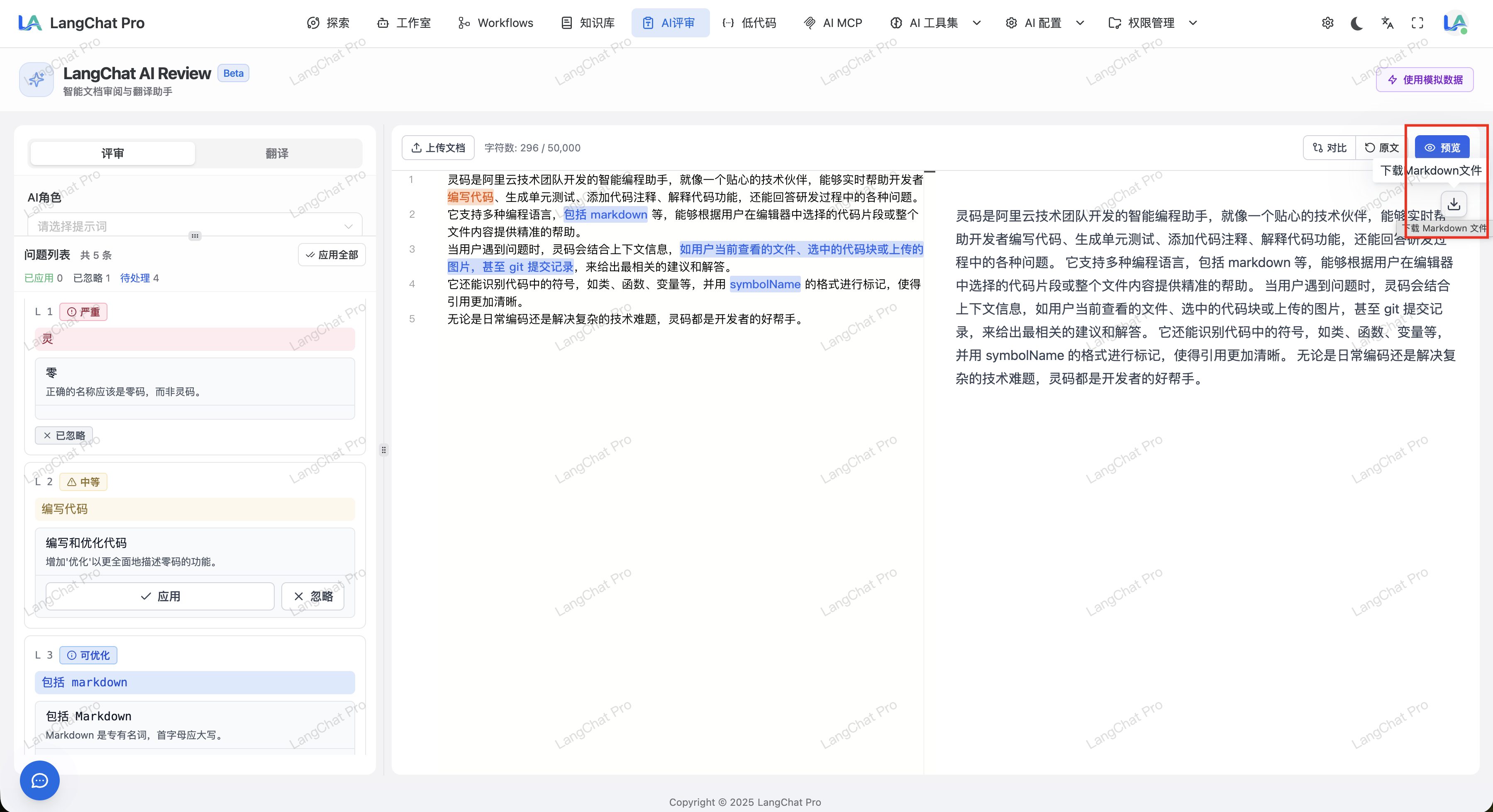 点击右侧的”预览”按钮,可以 Markdown 格式预览文档内容,并可下载为 .md 文件。