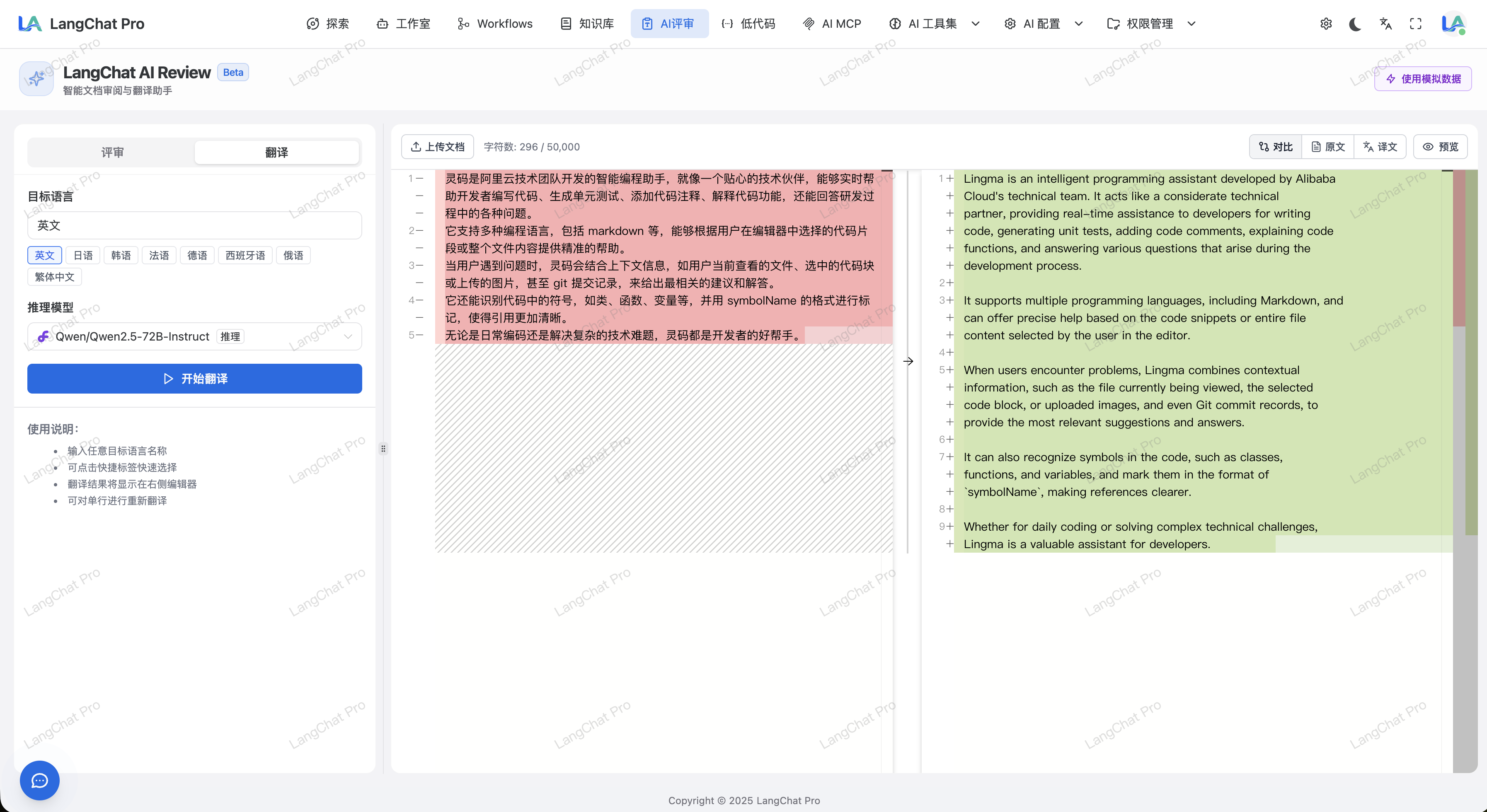 选择左侧的”翻译”选项卡,右侧编辑器将进入翻译状态,采用分栏布局显示原文和译文。