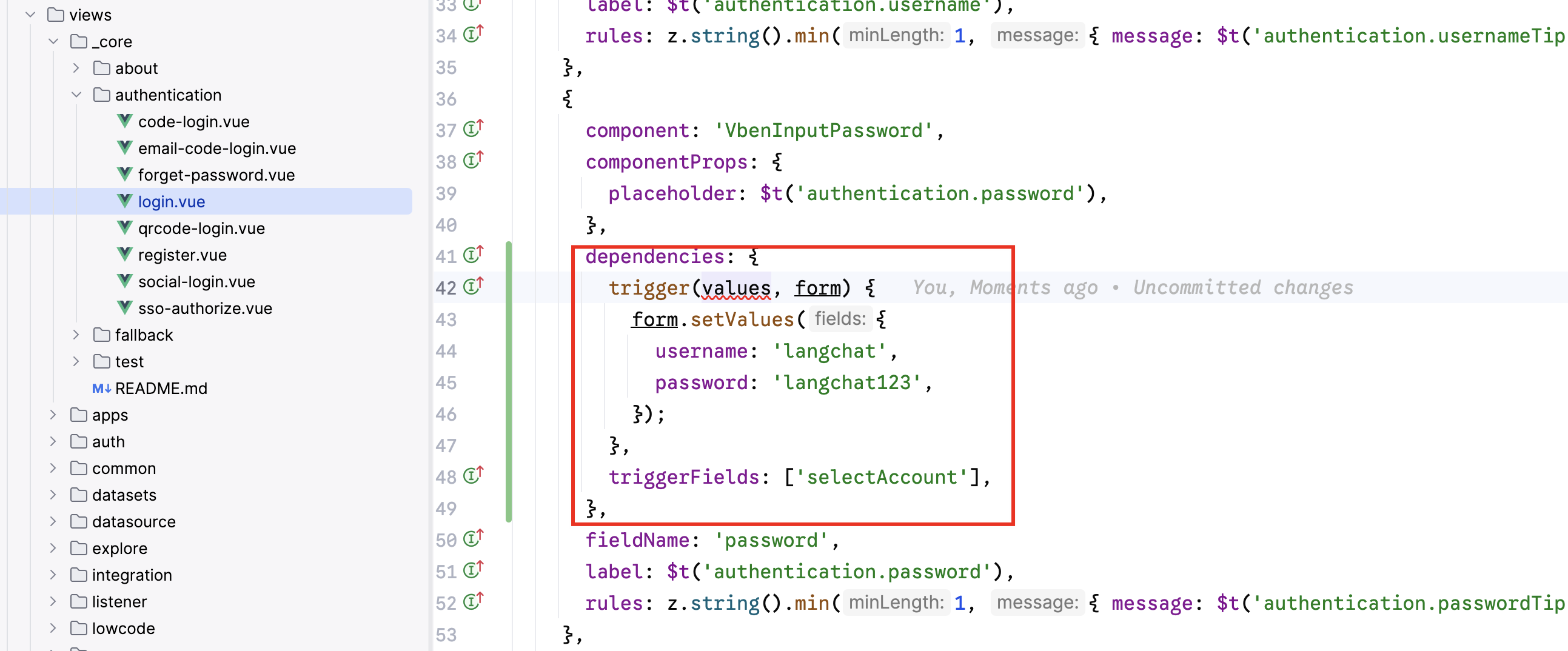 启动前端服务langchat-ui后,登录页面会默认填充用户名和密码,如果你不需要默认的填充,可以按照如下方式修改