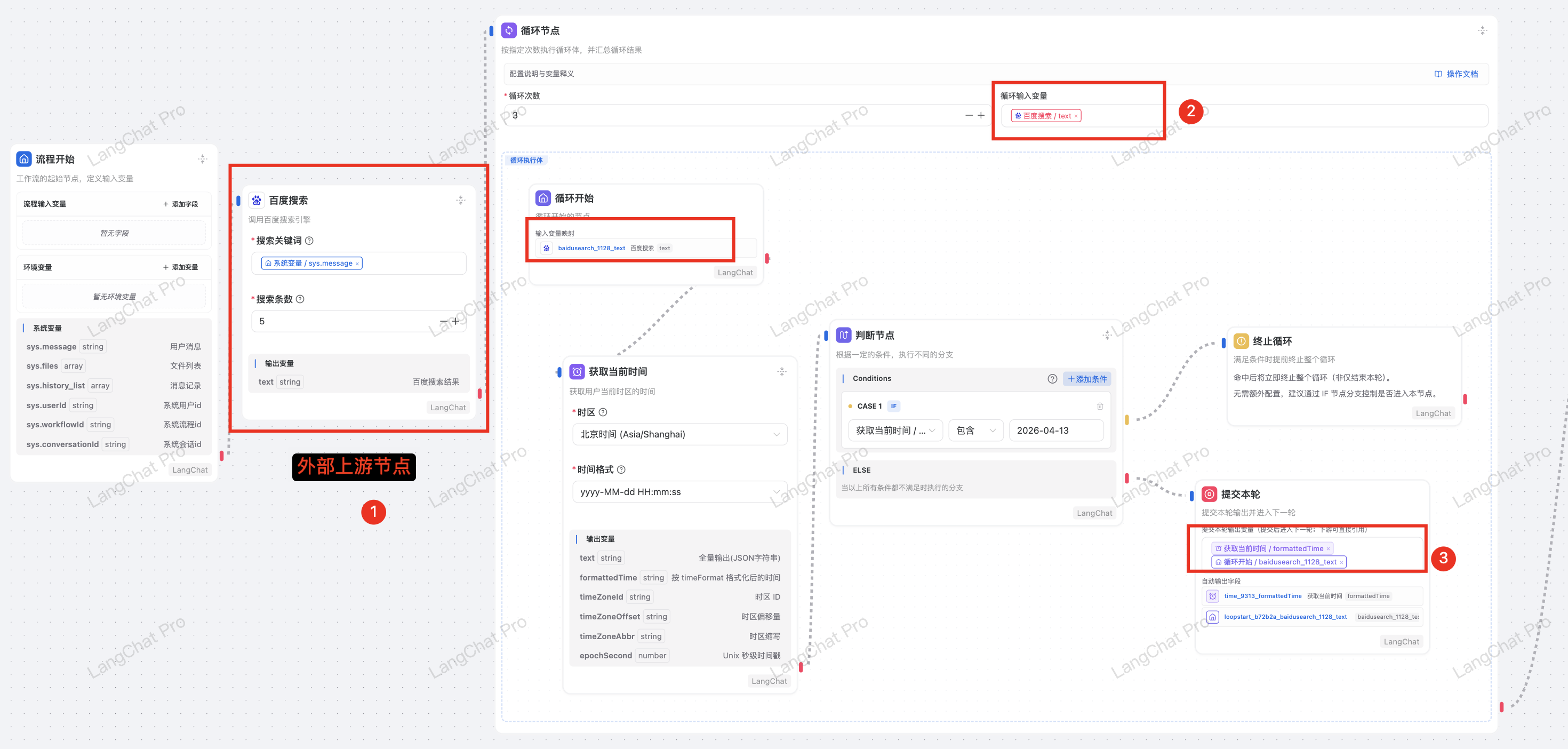 默认情况下,Loop内部的子流程是一个独立的流程,无法共享LoopNode上游节点的变量,但是很多情况下仍需要引用,那么可以在循环输入变量 中引入这些变量即可,例如: