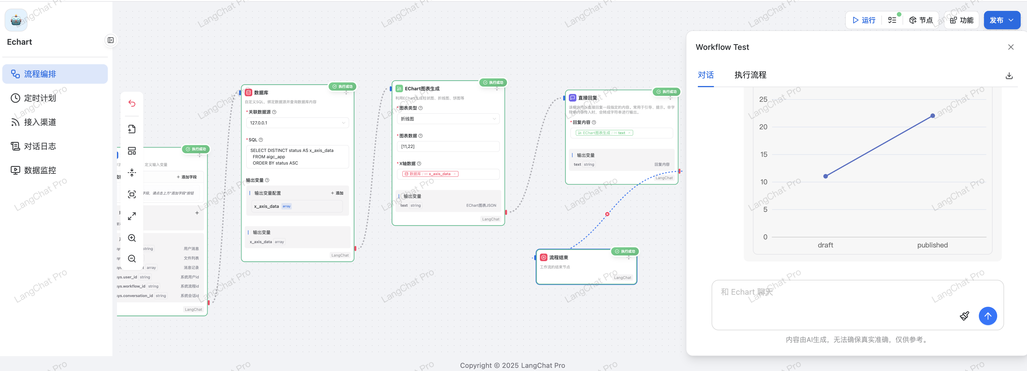 图表生成节点是LangChat Pro工作流中的模型节点,利用EChart生成柱状图、折线图、饼图等可视化图表,将图表数据作为变量传递给下游节点。