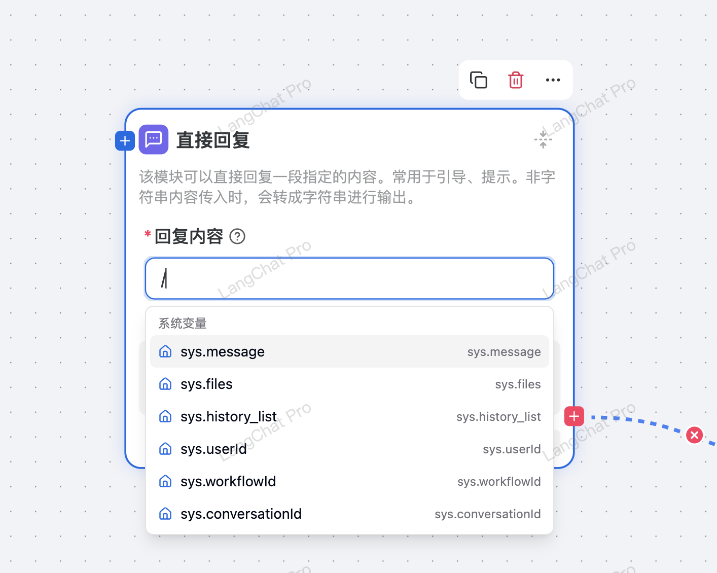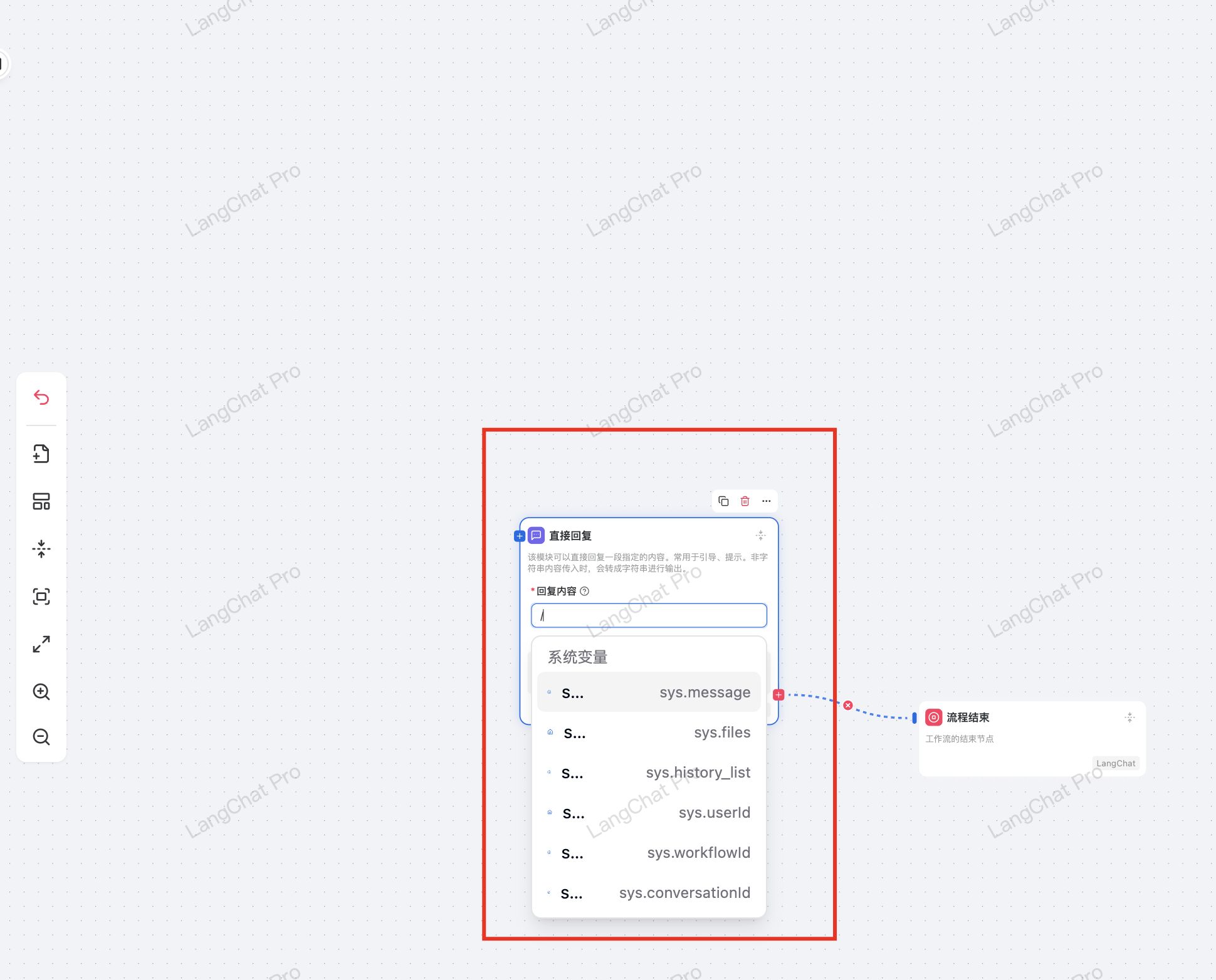 对应的,这个引用变量会在后端渲染为 {{#sys.message#}} 这个文本数据,后端会根据 {{#var#}} 这种结构解析上下文的变量数据