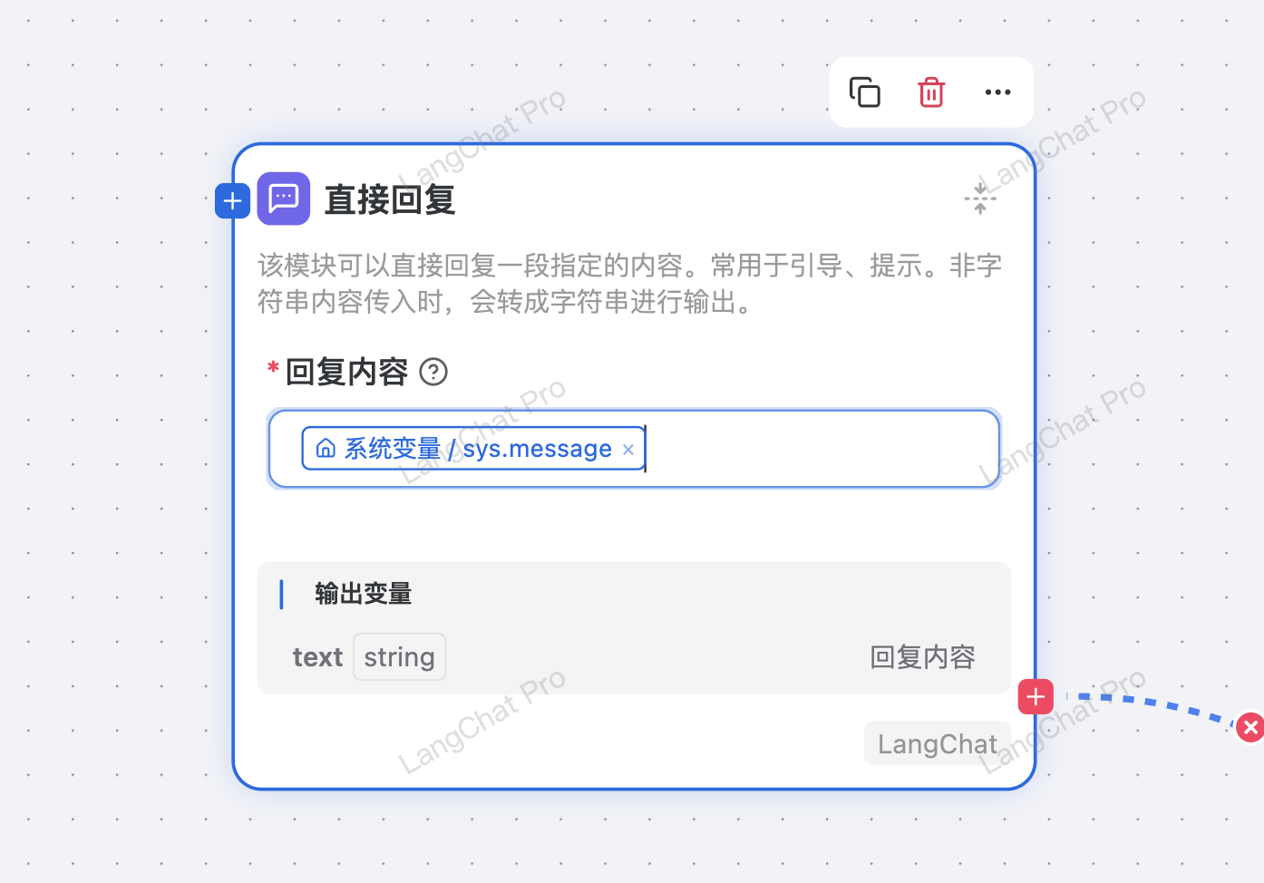 这个我们无论在已有文档还是帮助文档中,都多次解释,工作流节点中大部分节点都是工具节点,这些节点只负责处理数据并写到工作流上下文变量中,而如果需要向前端用户展示这些数据,就需要挂载一个 “直接回复” 节点。案例一