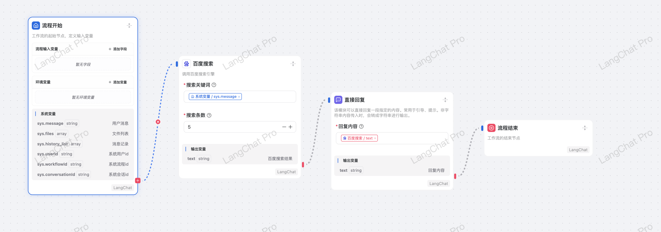 正确的配置,挂载一个 直接回复节点 输出百度搜索节点的内容: