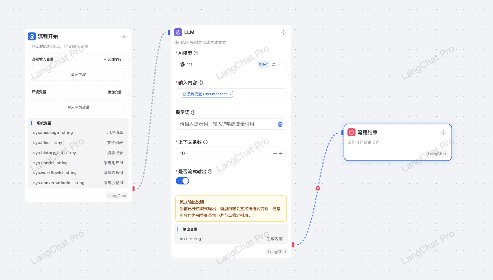 注意: 在 “开启流式输出” 的情况下,LLM节点是异步执行的,下游节点无法拿到上游节点的异步数据。