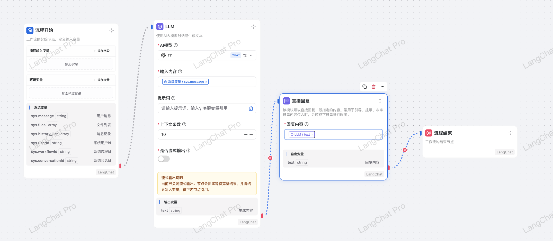 这样LLM节点就会阻塞执行,下游节点会等待LLM节点执行完毕后拿到完整的输出结果再处理。