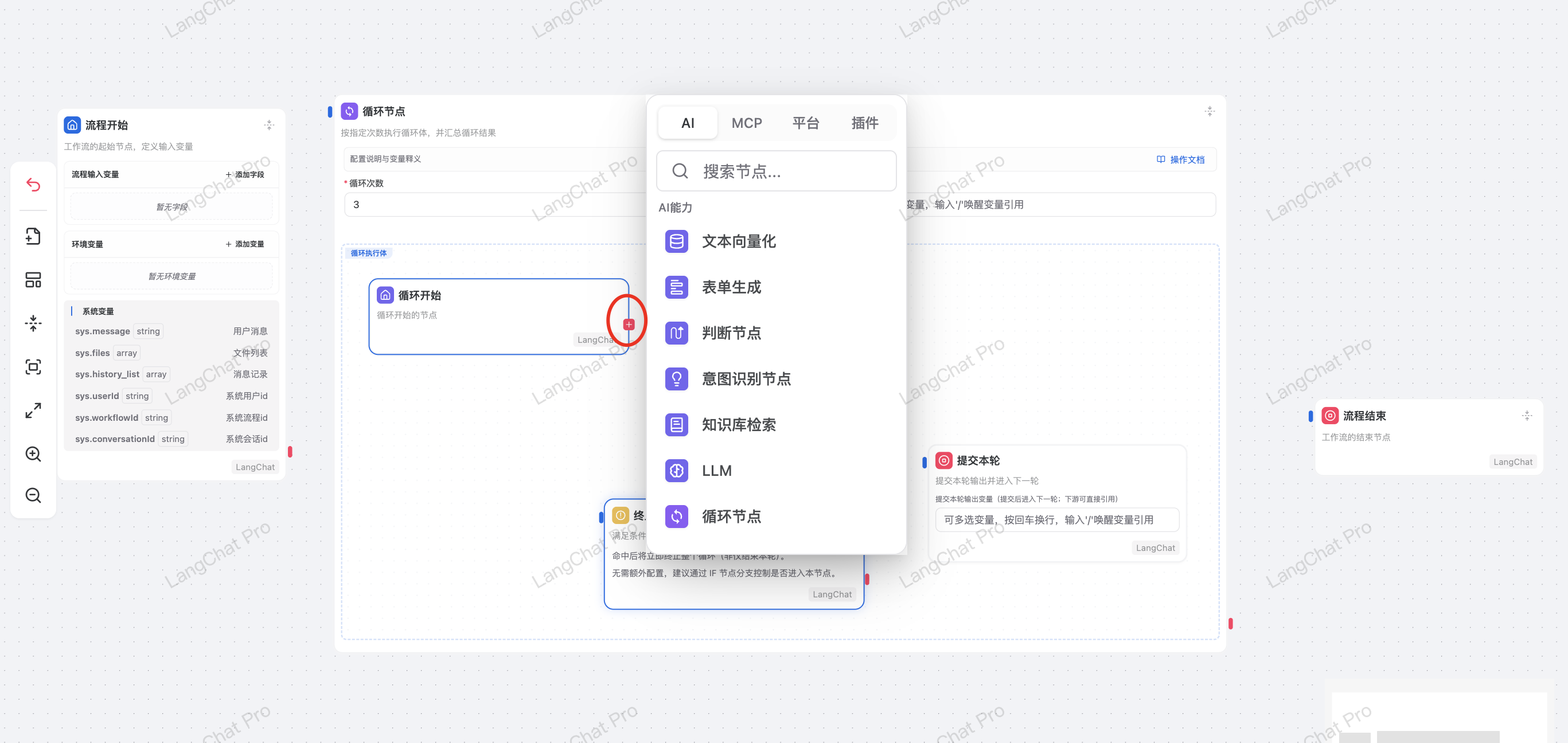 Loop是一个特殊的节点,其内部包含了一个子流程区域,因此内部的画布区域和外层工作流的画布是隔离的,内部的节点不能拖拽到外部,外部的节点也不能拖拽进去。 如何添加新节点?
